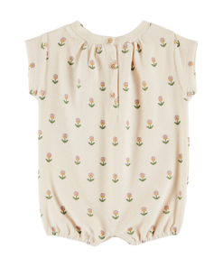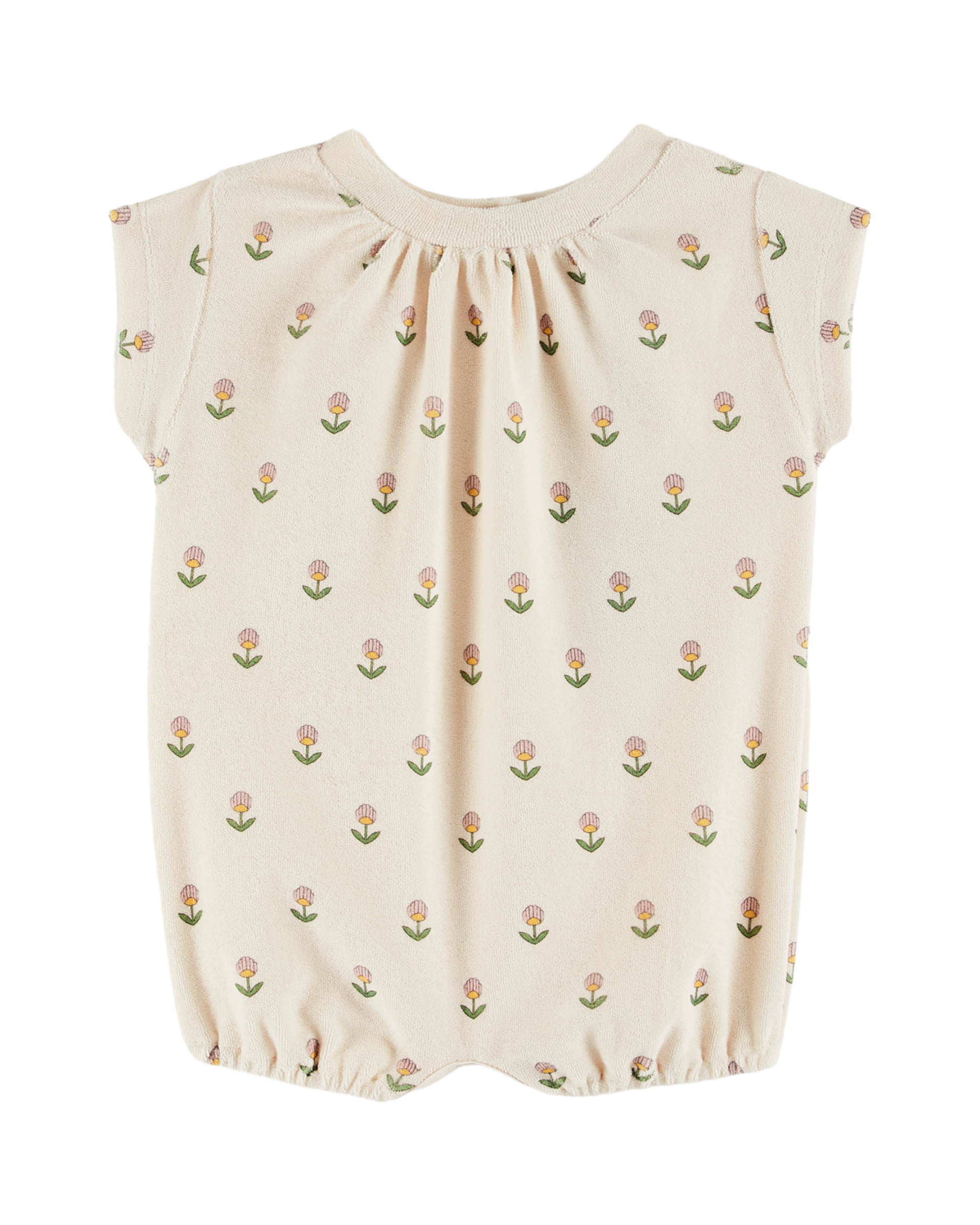 Off-white terrycloth slip, printed with mauve petal flowers. Made from ultra-soft, fluffy, stretchy terry velvet, it offers unrivaled comfort. The terry finish on the crew neckline, short sleeves and elasticated thighs give this romper a first-day look. The three snaps at the crotch make for easy changing, and the wooden buttons on the back make for easy head passage.
