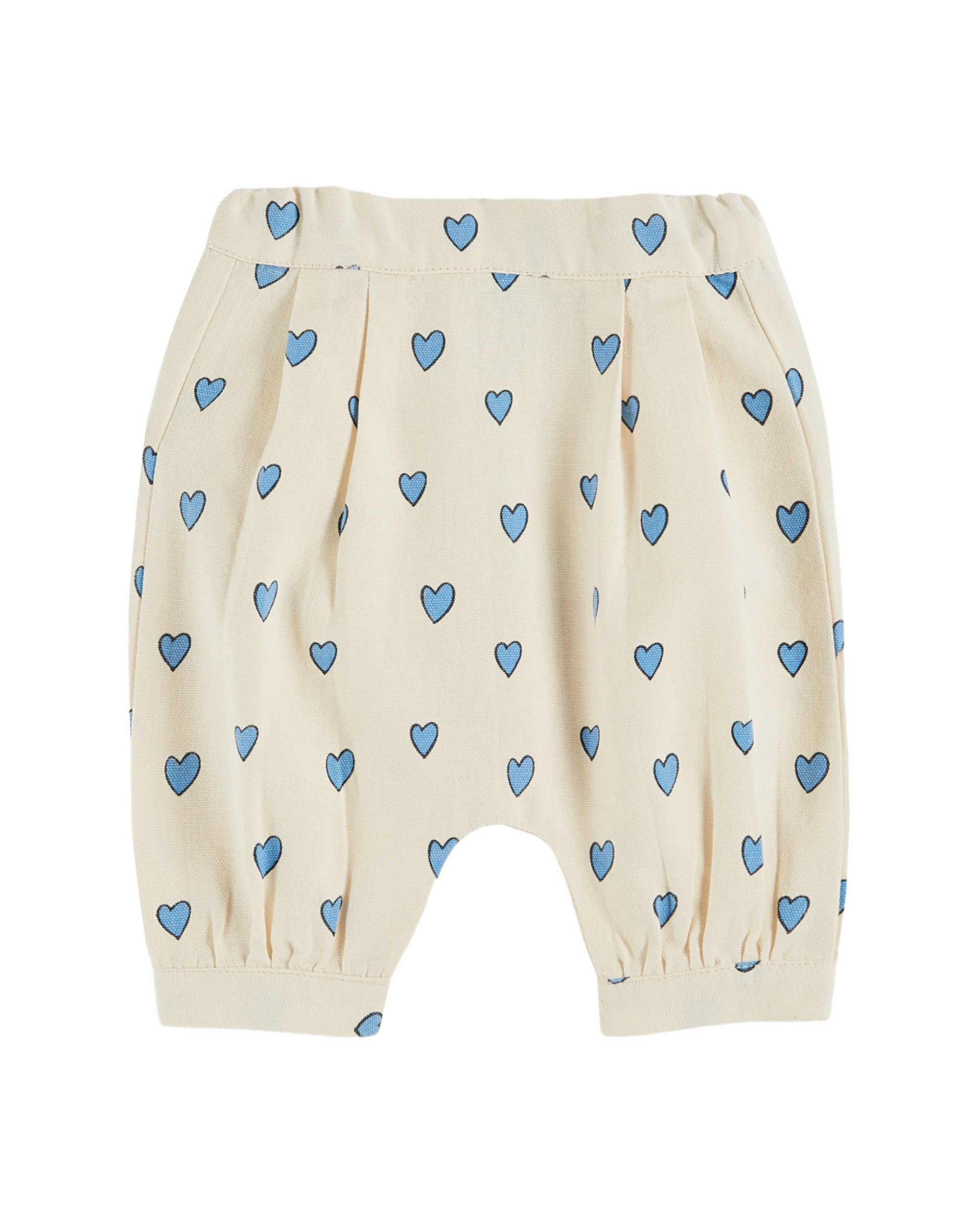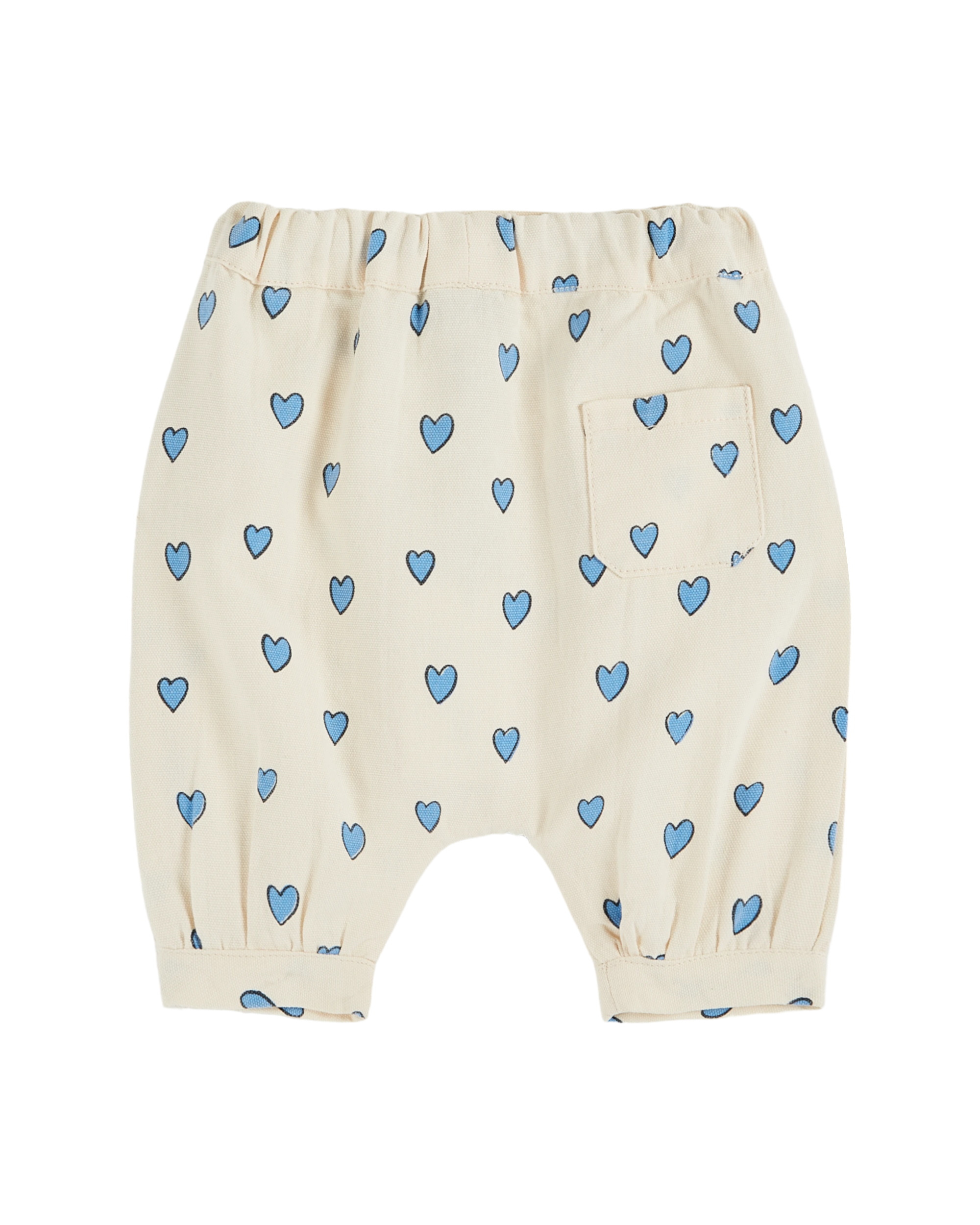 Off-white cotton canvas saroual printed with little blue hearts. In the back, a buttoned elastic band slides into the added waistband, and a patch pocket enlivens the buttocks. On the forehead, recumbent pleats provide ample volume for all the cans. The lower legs are tightened at the ankles to keep the wind out and your babies cool.