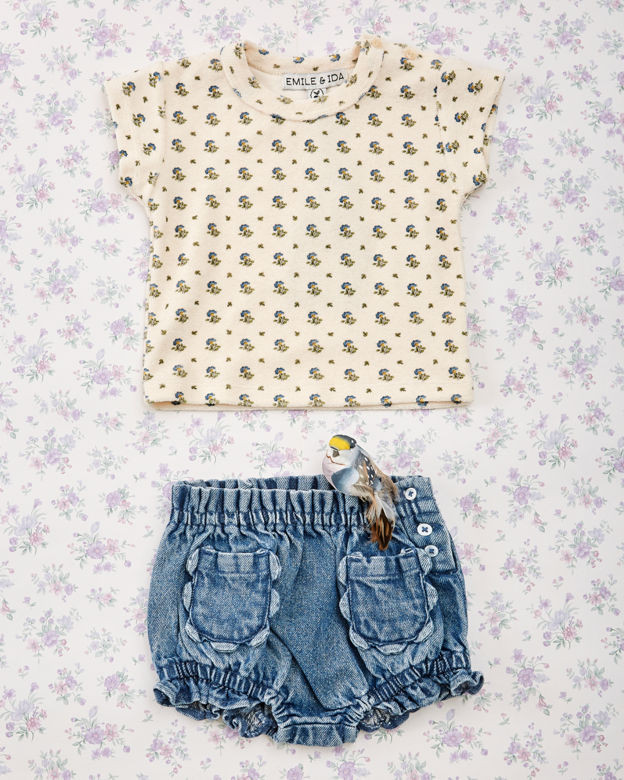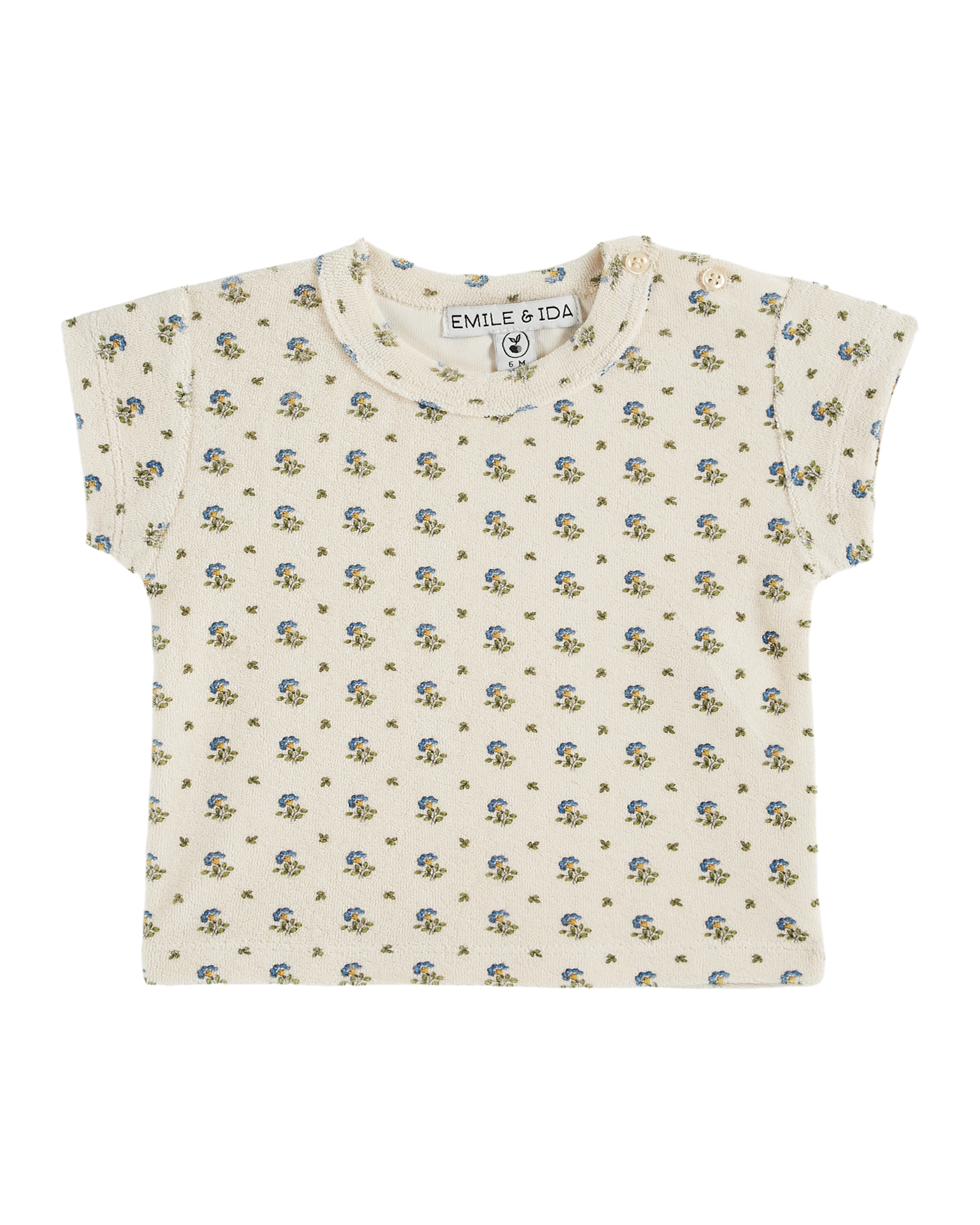 Cream terry T-shirt with vermilion-red tulips. Made from ultra-soft, plush and stretchy terry velvet, it offers unrivaled comfort. Crew neckline, stitched hems and short sleeves. An opening on the shoulder closes with tone-on-tone buttons, allowing the head to be passed over without tearing off the little treasure’s nose or ears.