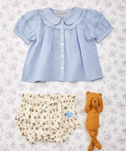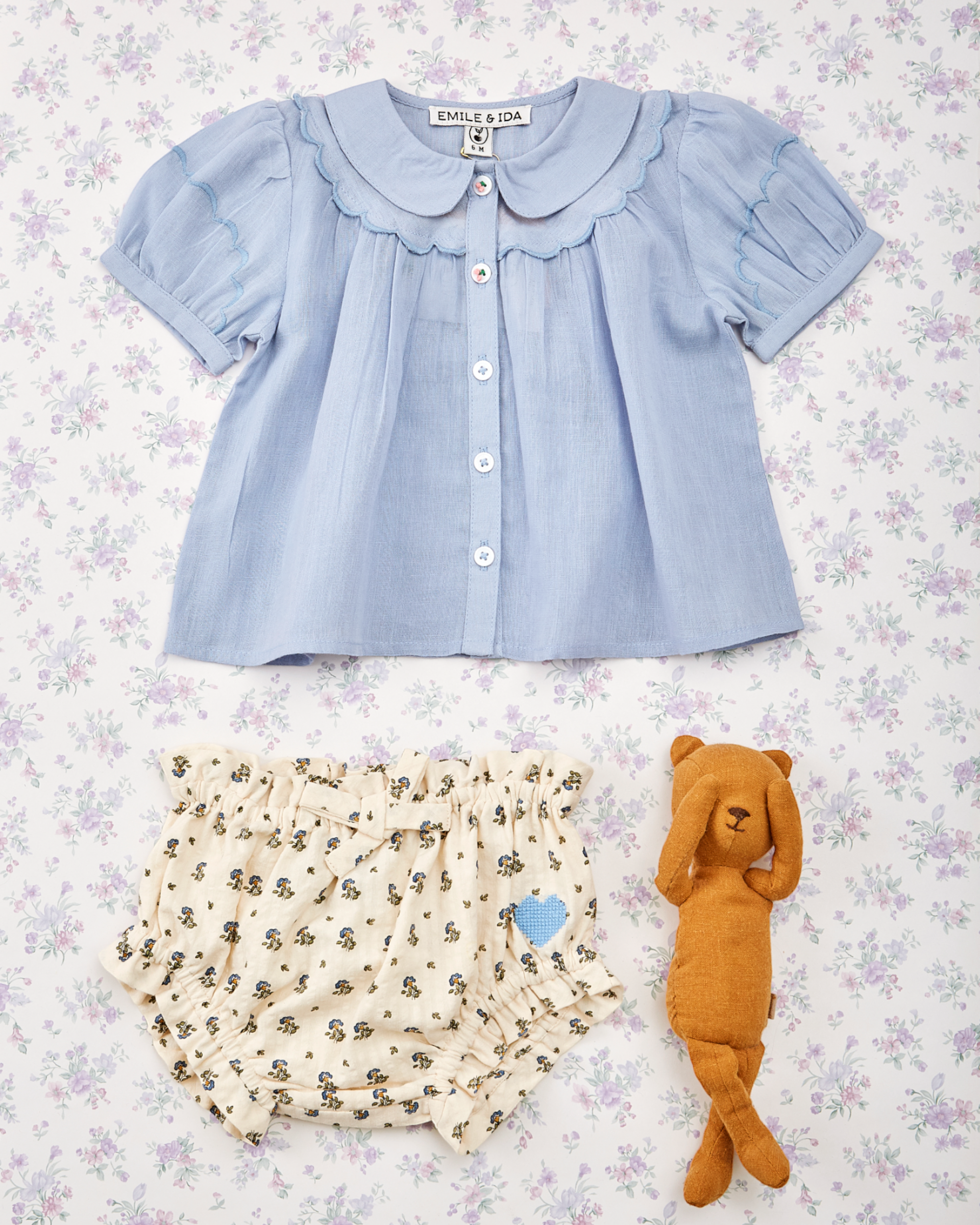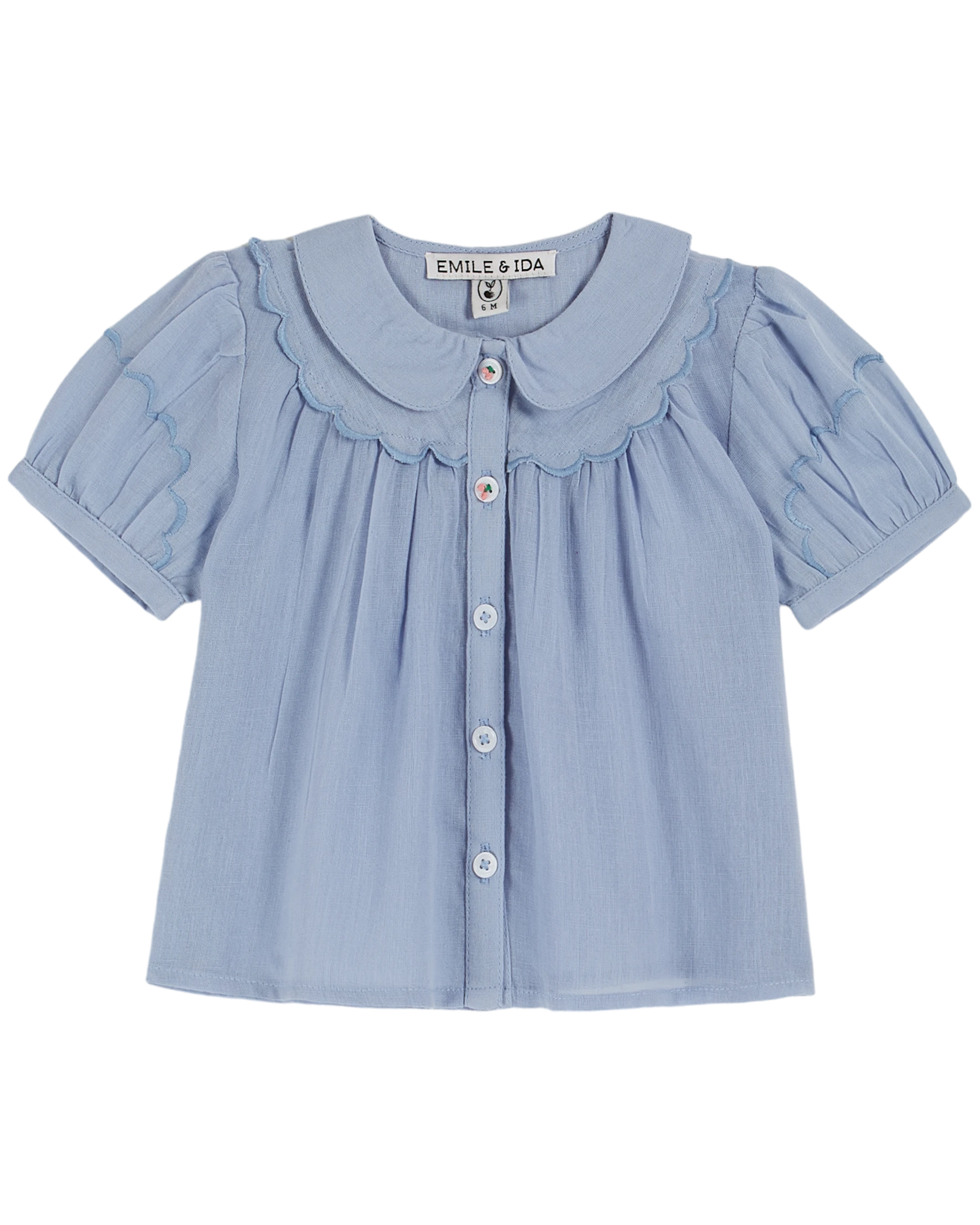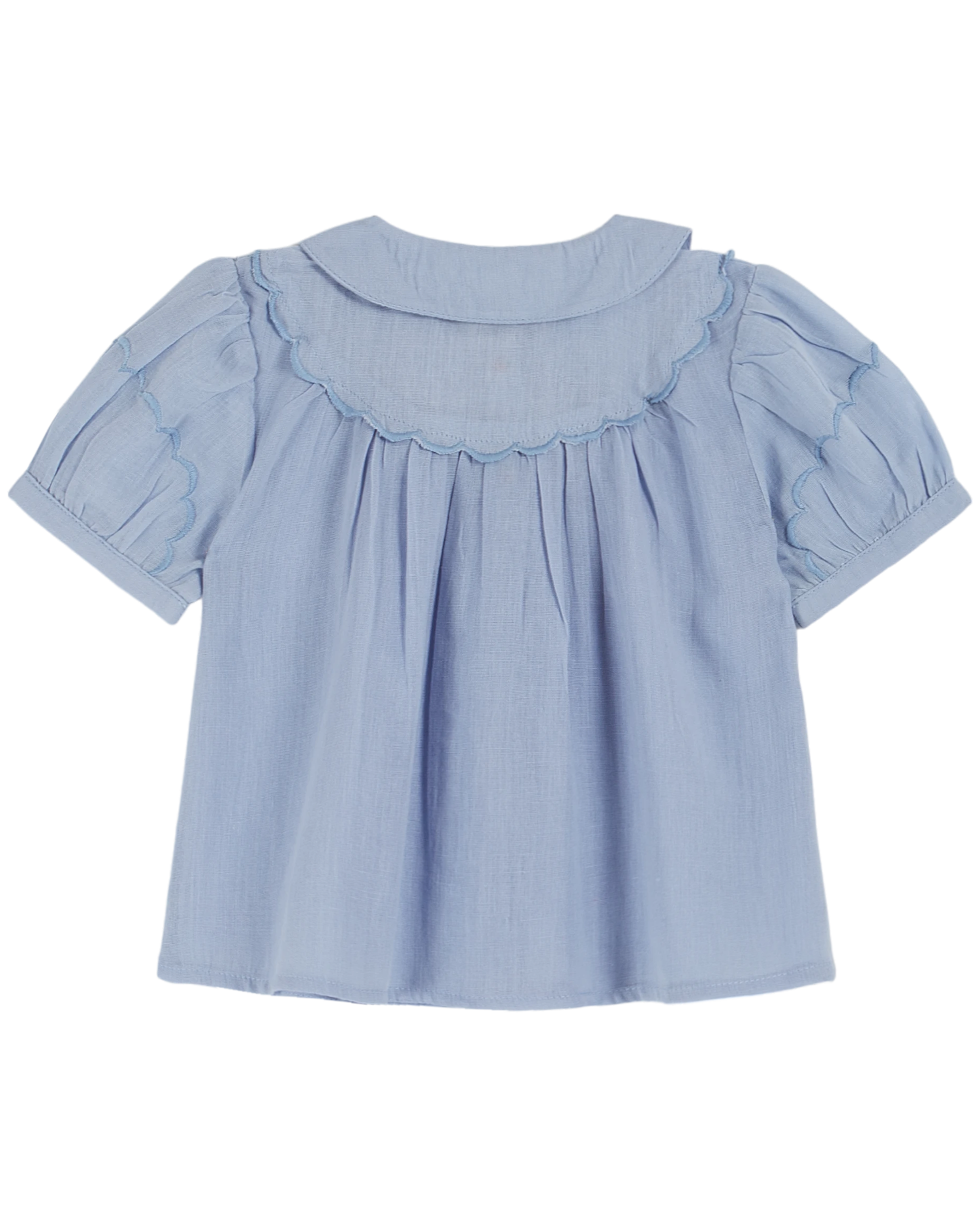 Blue cotton blouse. A flared blouse with a circular, scalloped yoke edged in blue satin stitch. It underlines the Claudine collar and supports the gathers of the bodice that give the blouse its fullness. It opens and closes all the way up with beautifully stitched natural mother-of-pearl buttons. The scallops on the yoke are repeated on the balloon sleeves.