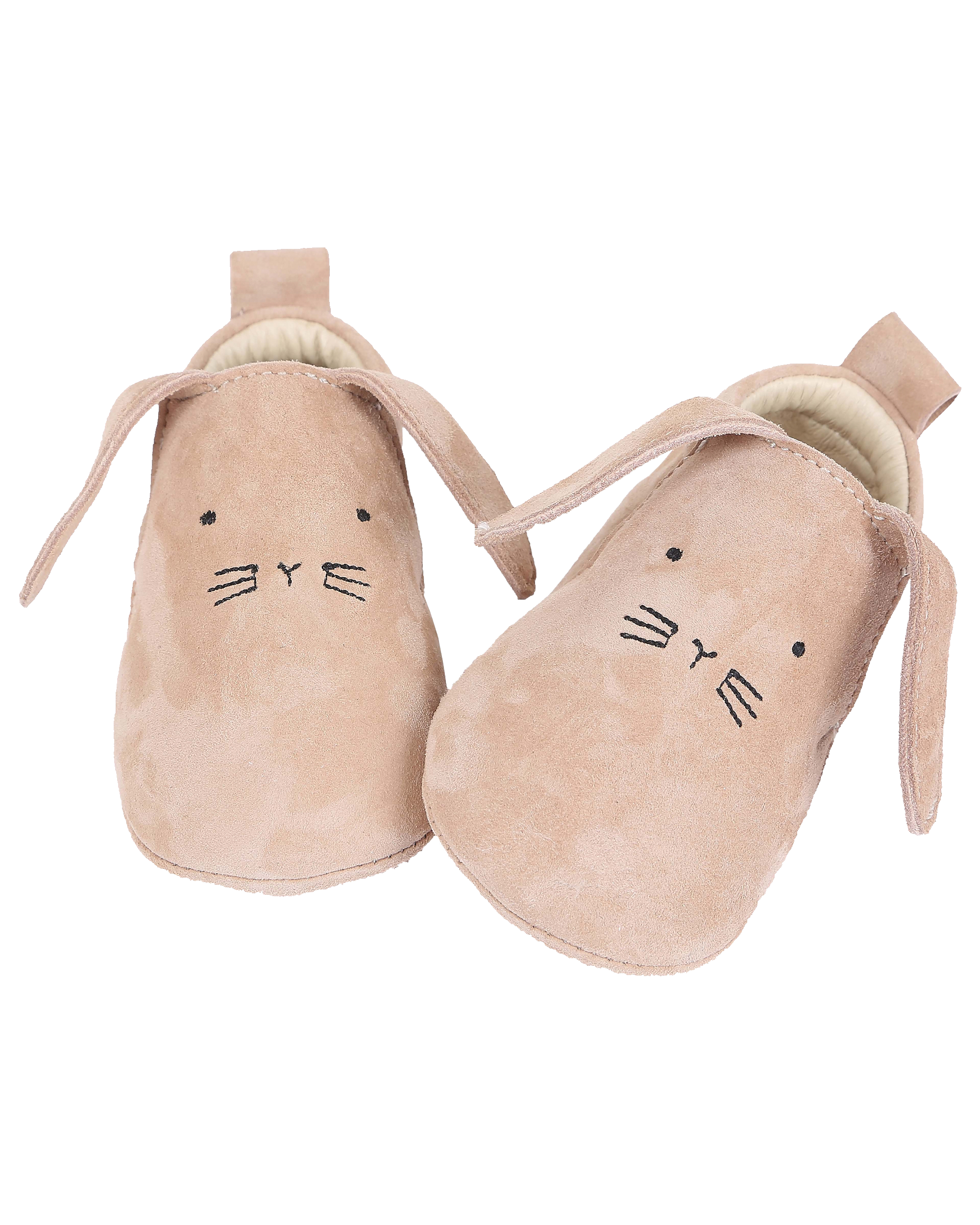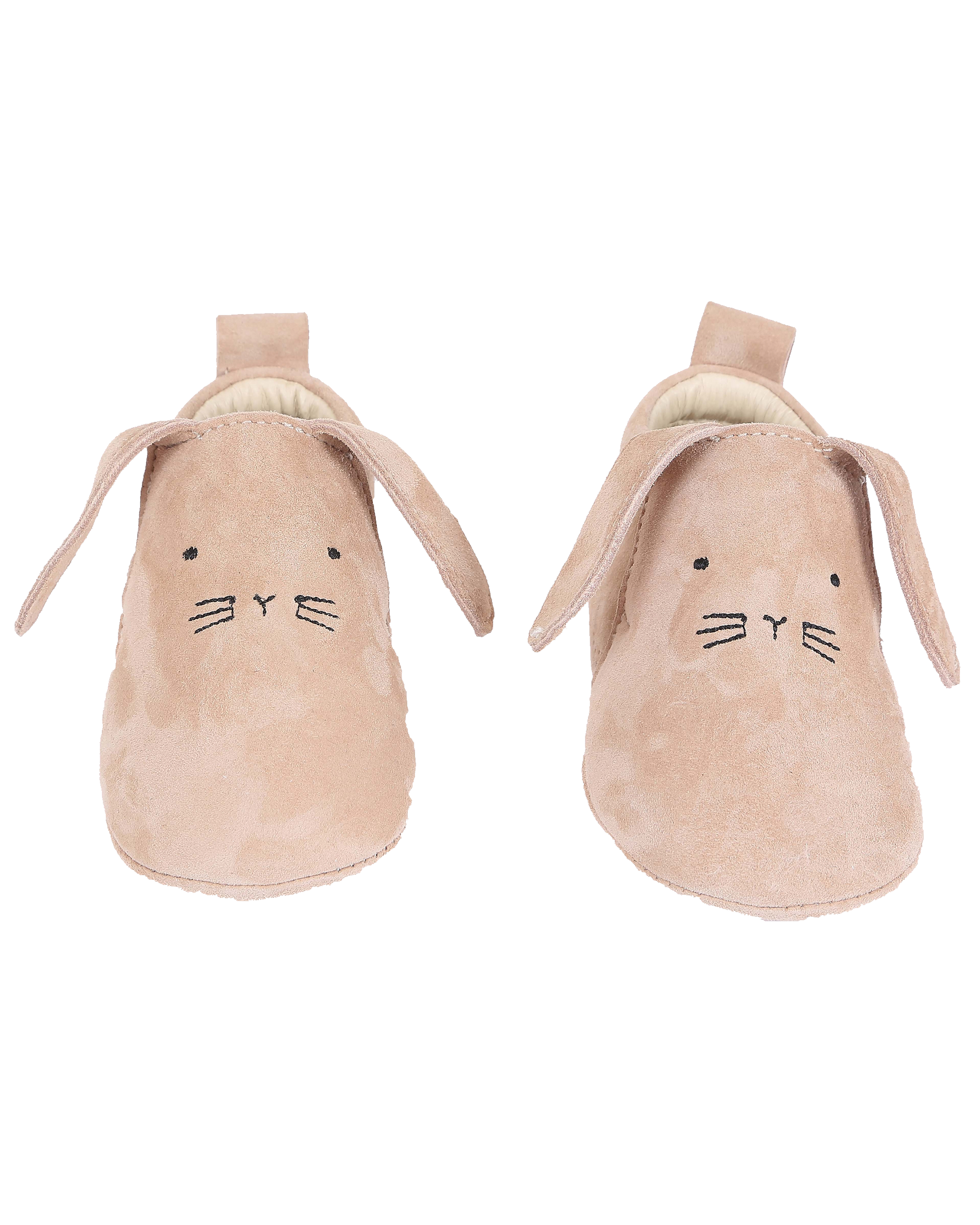 Leather rabbit slippers in beige. Soft, fully leather lined slippers, with an elastic under the tongue and a pull tab at the back for easy slip on. We like the embroidered muzzle on the instep and the big ears falling on the upper. Adopt these booties and you will have a good reason to call your babies “my little bunny”.