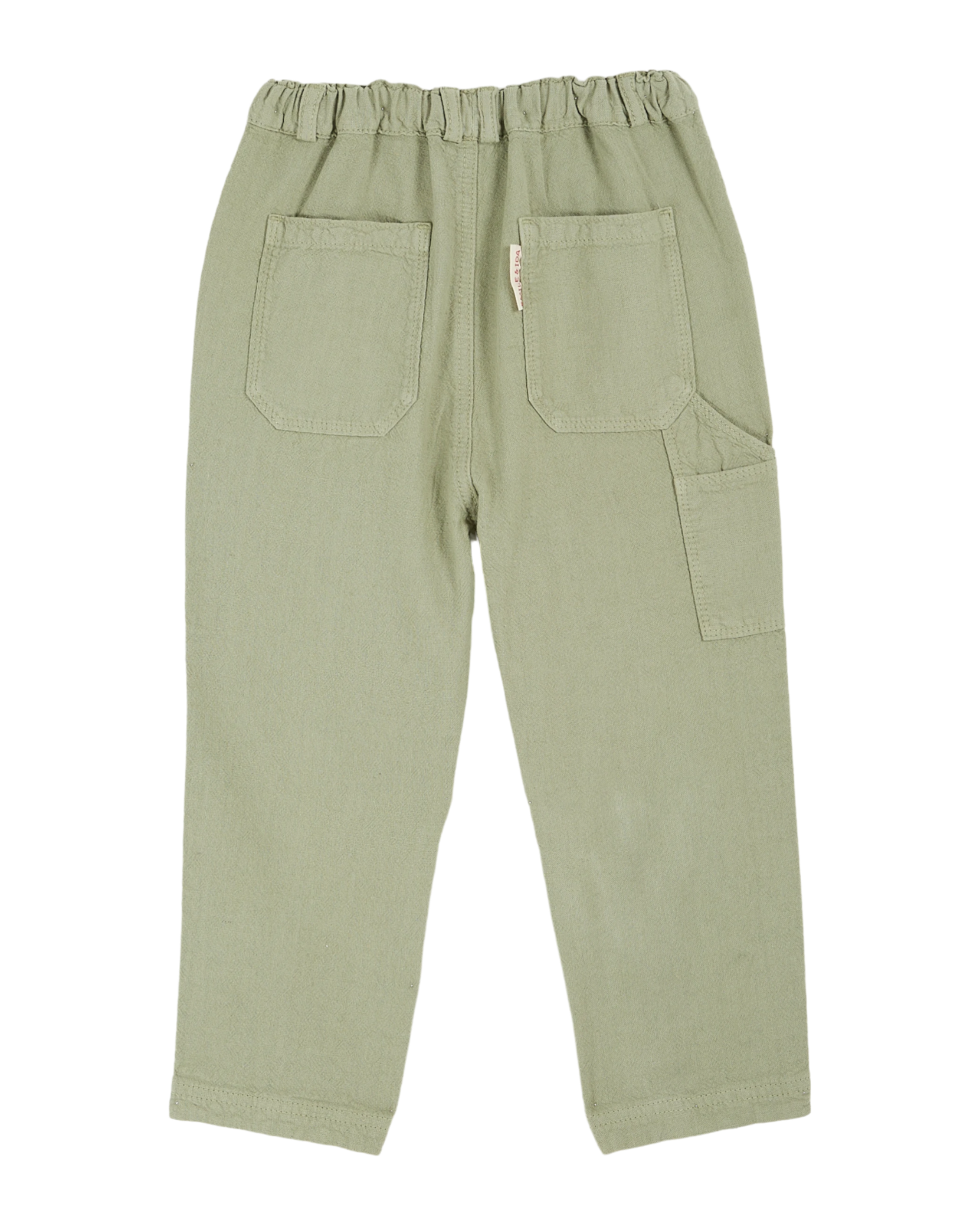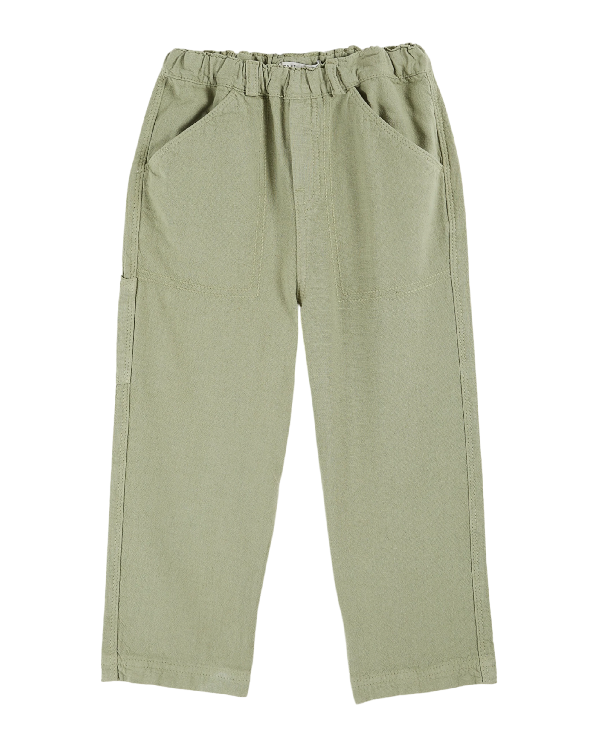 Green linen and cotton canvas pants, lightweight and comfortable to wear in warm weather. The hypoallergenic, breathable linen is perfect for sensitive skin, offering freshness and comfort while avoiding irritation. The pants are mounted on an adjustable waistband with belt loops and button elastic. Easy to put on, they are suitable even for the youngest, giving them greater independence. Italian pockets are discreetly highlighted with topstitching, while other patch pockets, on the buttocks and one leg, hold little treasures.