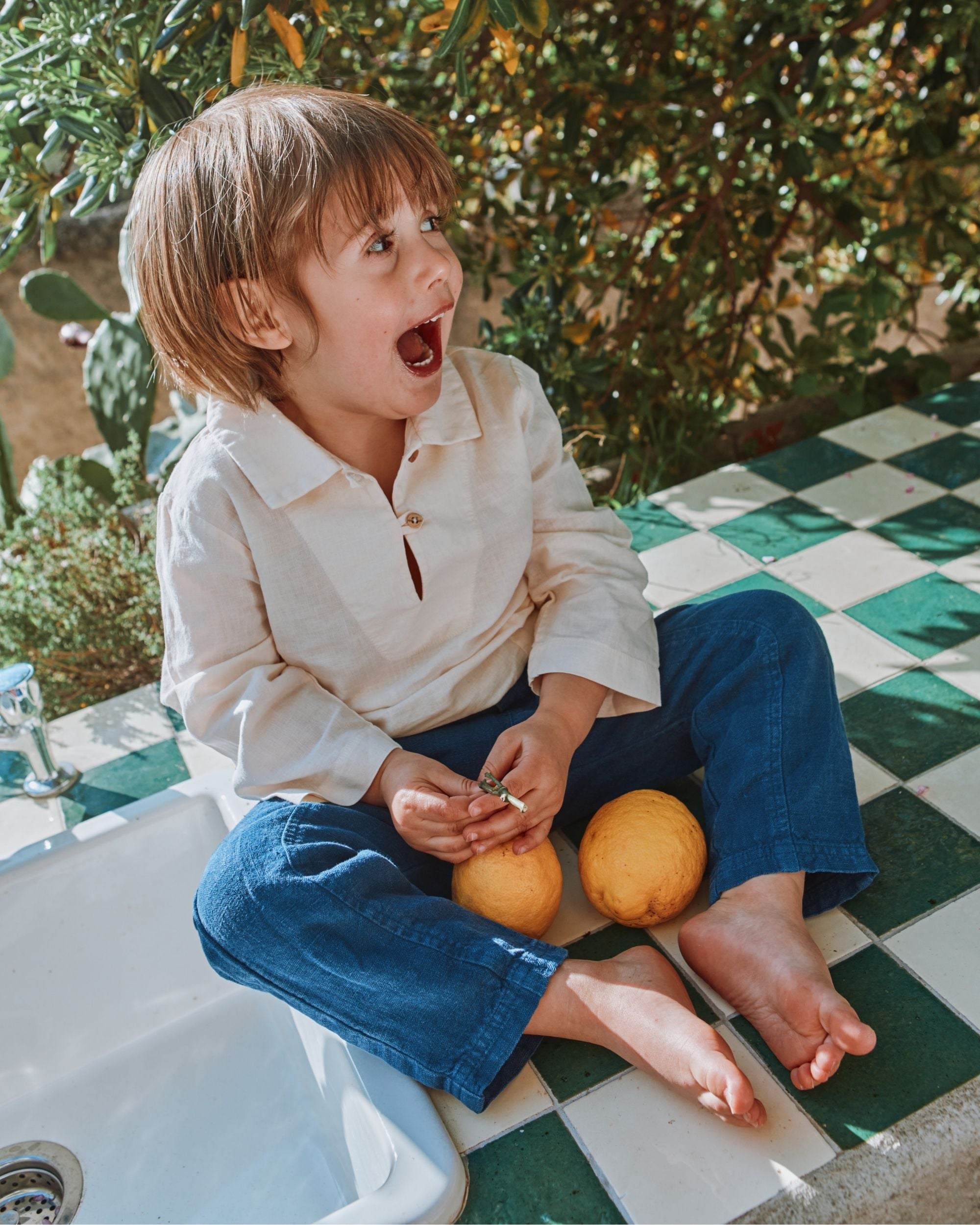Blouse in cream linen and cotton. We revisit the sailor’s jacket. We abandoned cotton canvas for a soft, lightweight, heat-regulating material, added a button to close the neckline and sewed the pocket to the outside. We kept the classic collar, long sleeves, straight cut and simple shape. On the pocket, you’ll find the embroidered black moustache, emblematic of Emile and Ida.