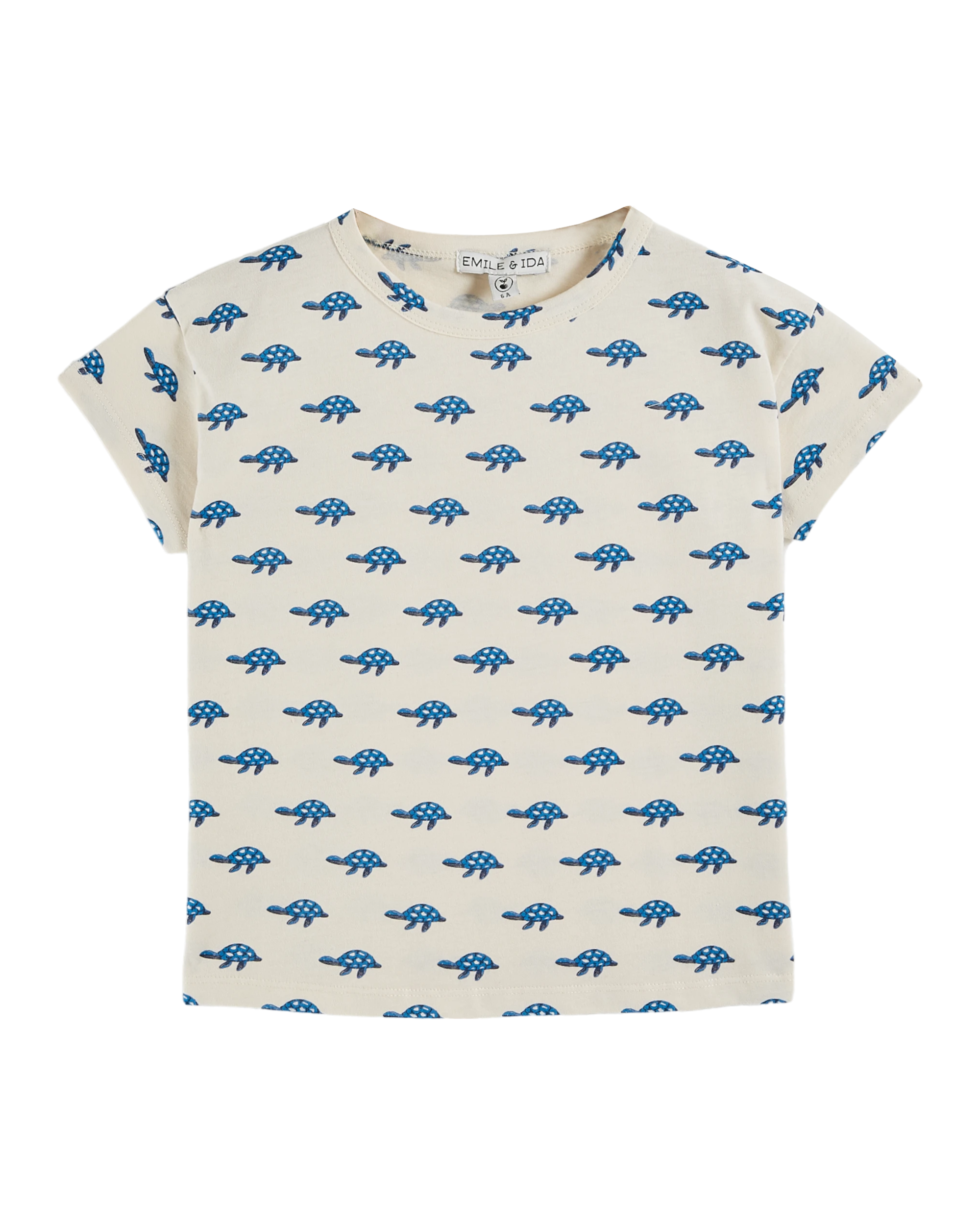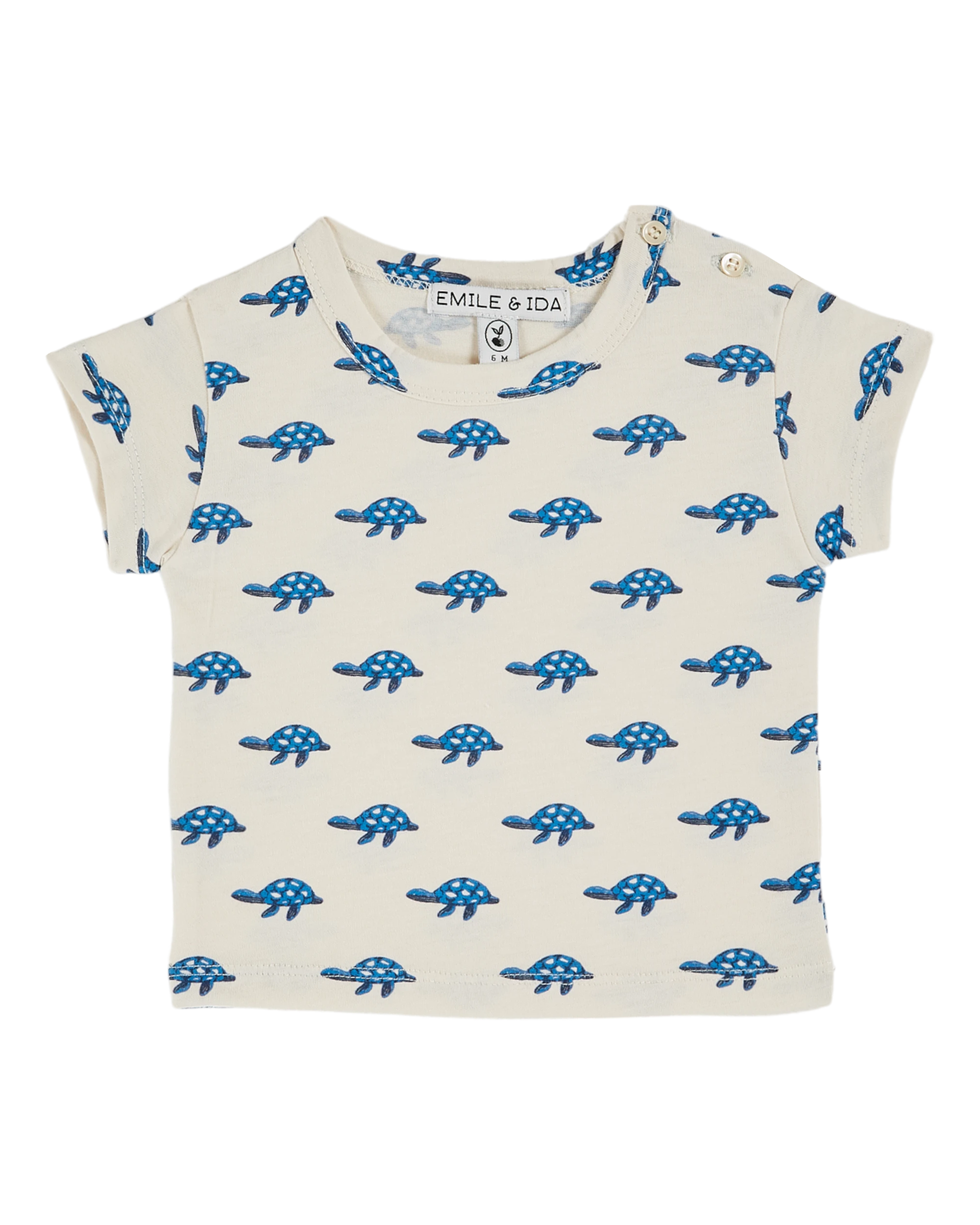 Ecru organic cotton t-shirt, printed with blue sea turtles. A tee-shirt trimmed with ribbing around the neckline and topstitched at the sleeves and hem. It’s so soft, your kids won’t want to take it off.