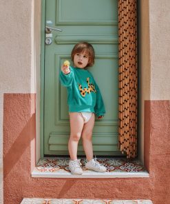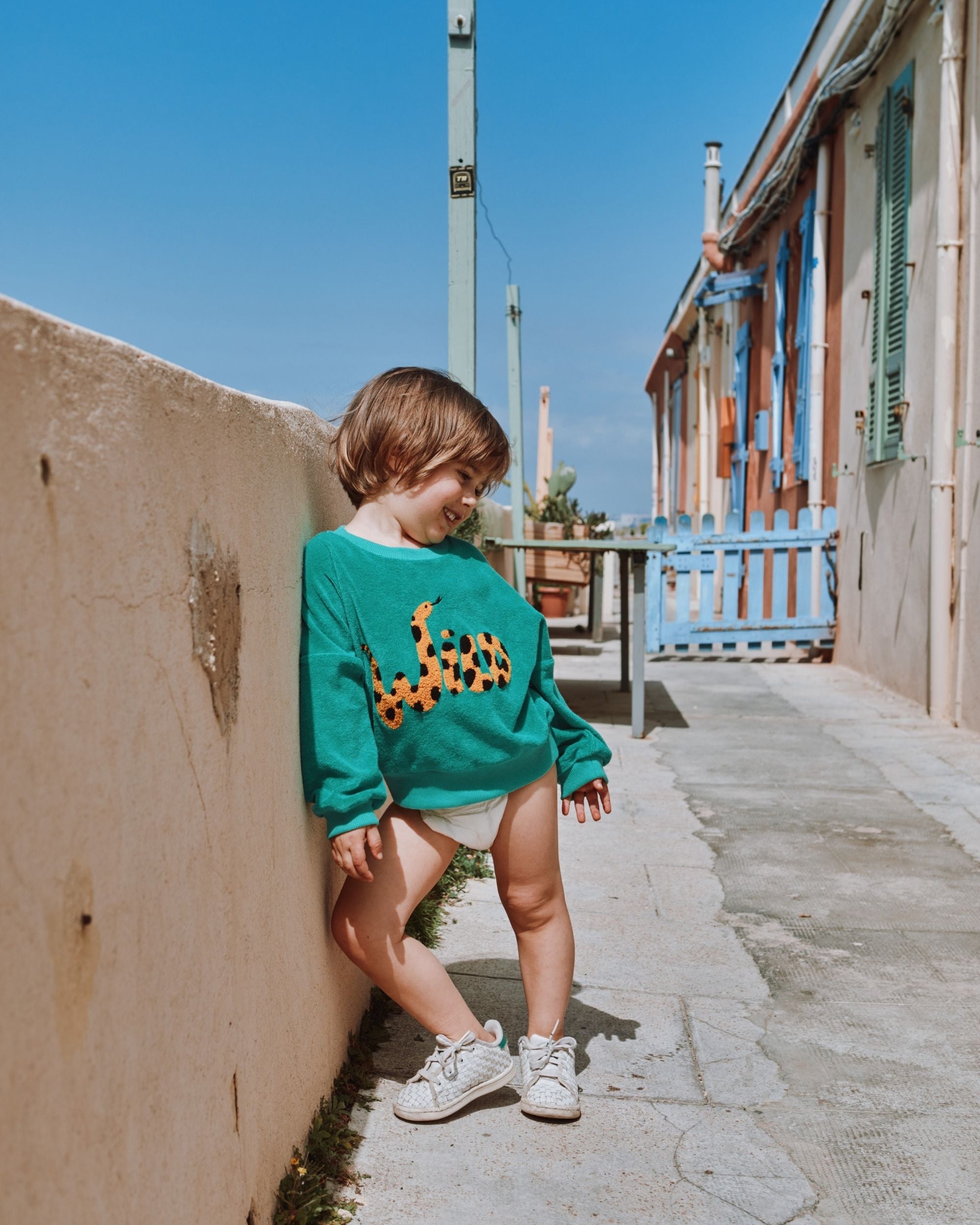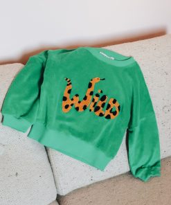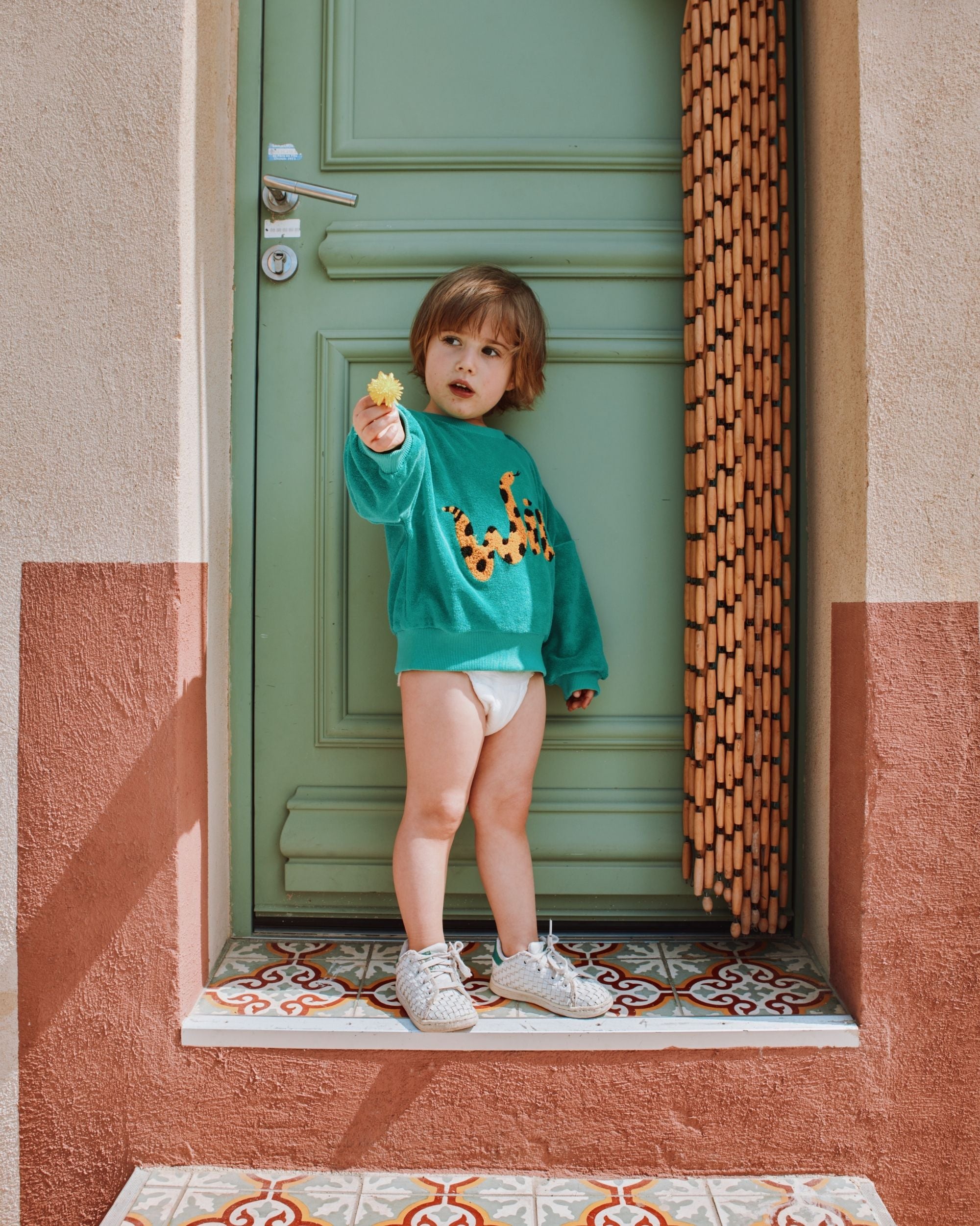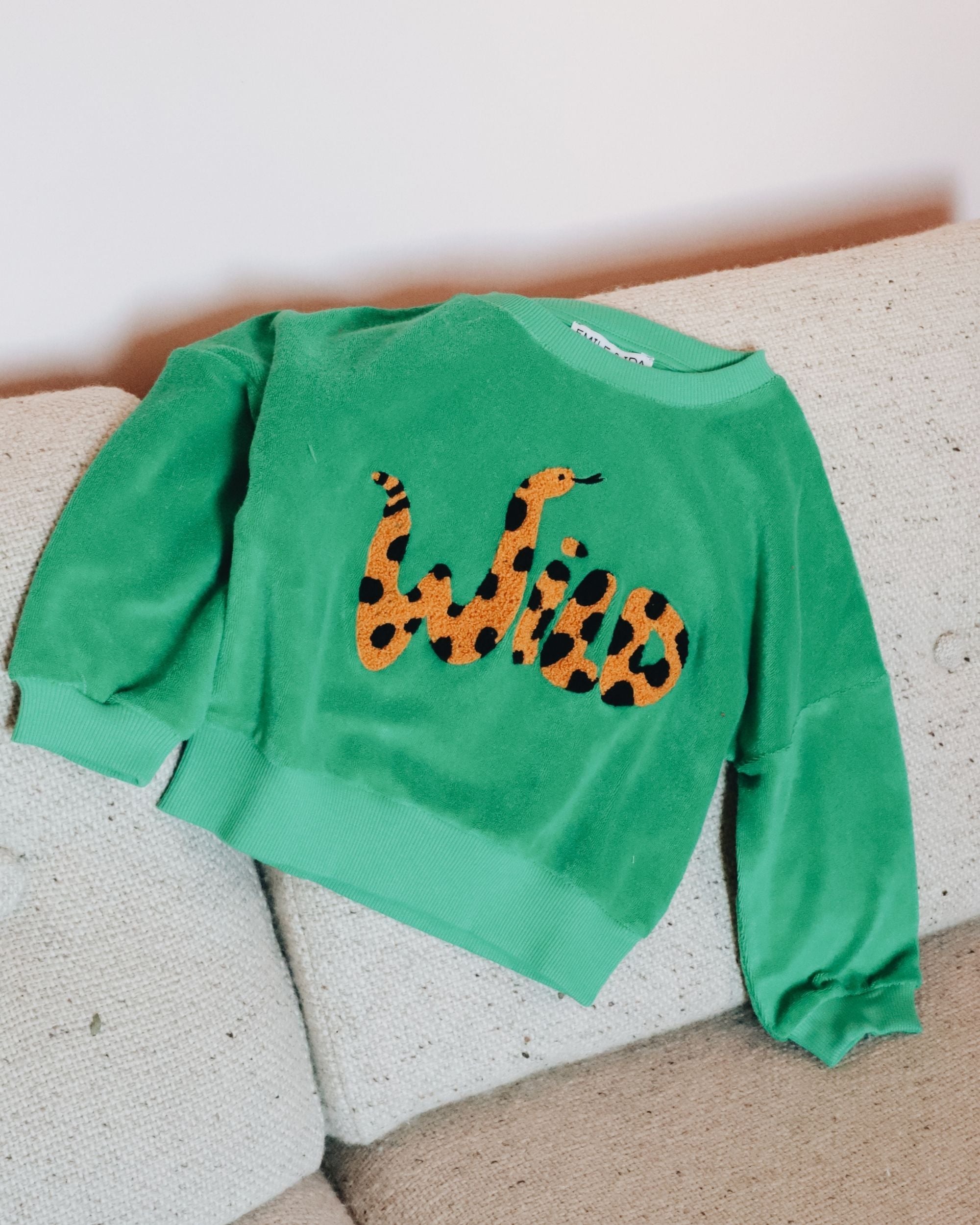 Grass green terry sweatshirt. Crafted in ultra-soft, plush, stretchy terry velvet, it offers unrivaled comfort. A sweatshirt with tonal ribbing at the cuffs, around the neckline and at the hem, long sleeves with offset armholes. Inspired by a trip to Zanzibar, there’s a snake on the chest, letting us know it wants to stay wild, on its island. So we reproduced it in bouchette embroidery and tamed it so it wouldn’t bite any children.