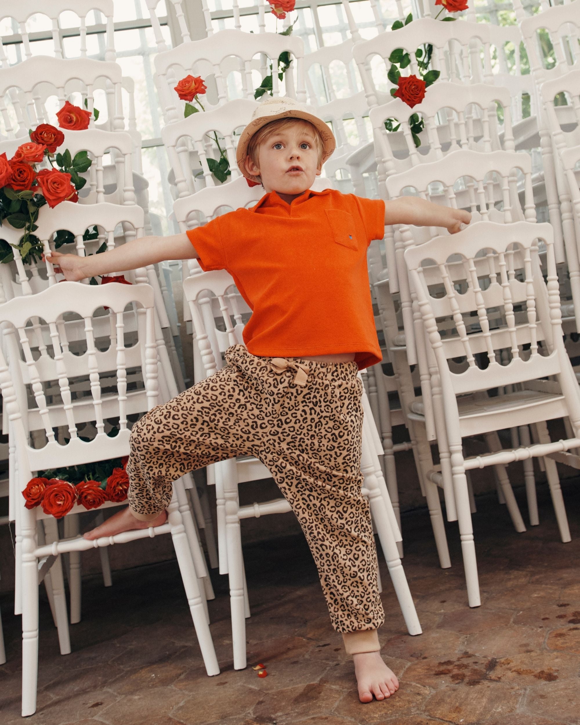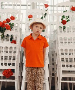 Orange-red terry polo shirt. The blend of cotton and polyester creates a soft, plush and comfortable fabric. The polyester, added in small quantities to the cotton, gives the fabric exceptional elasticity and prevents wrinkling. This polo features a pointed collar, an opening that doesn’t close but makes it easy for the head to pass through, and a chest pocket decorated with a small embroidered blue apple.