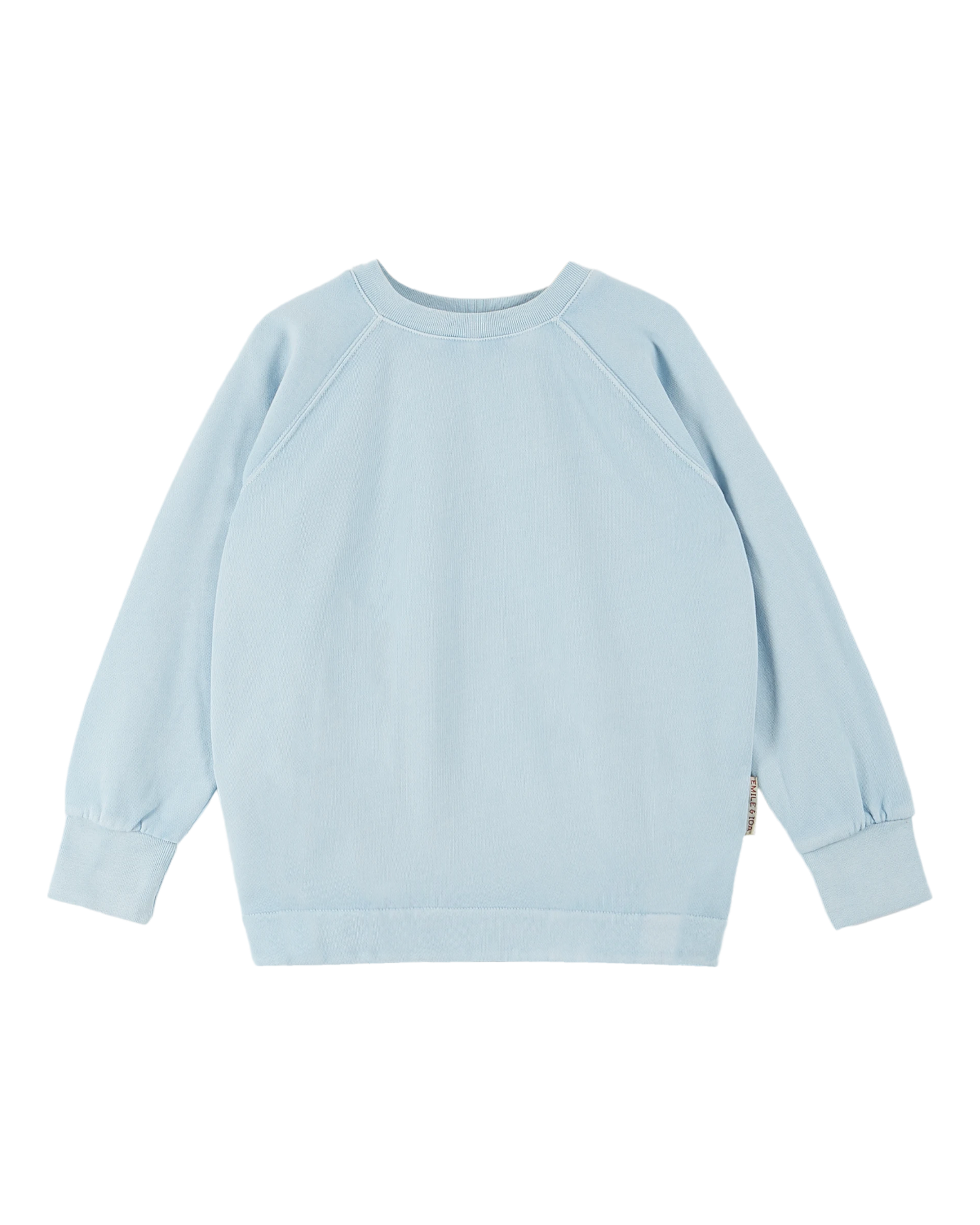 Sweatshirt in plain ice-blue organic cotton. A sweatshirt with long raglan sleeves, round neckline finished with ribbing, like the cuffs, around the neckline and at the hem. And, of course, the softest fabric. This product is piece-dyed using mineral pigments, a more environmentally-friendly coloring method. It also offers a subtle, unique color that develops a patina over time.