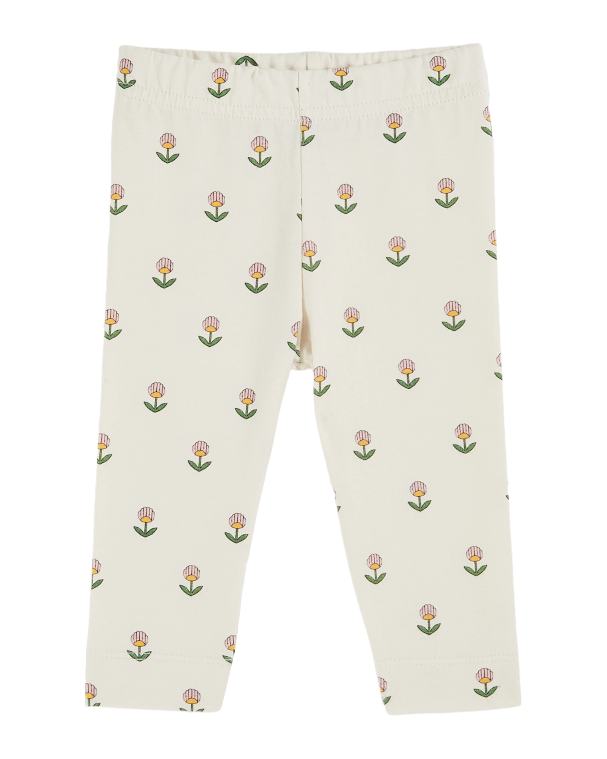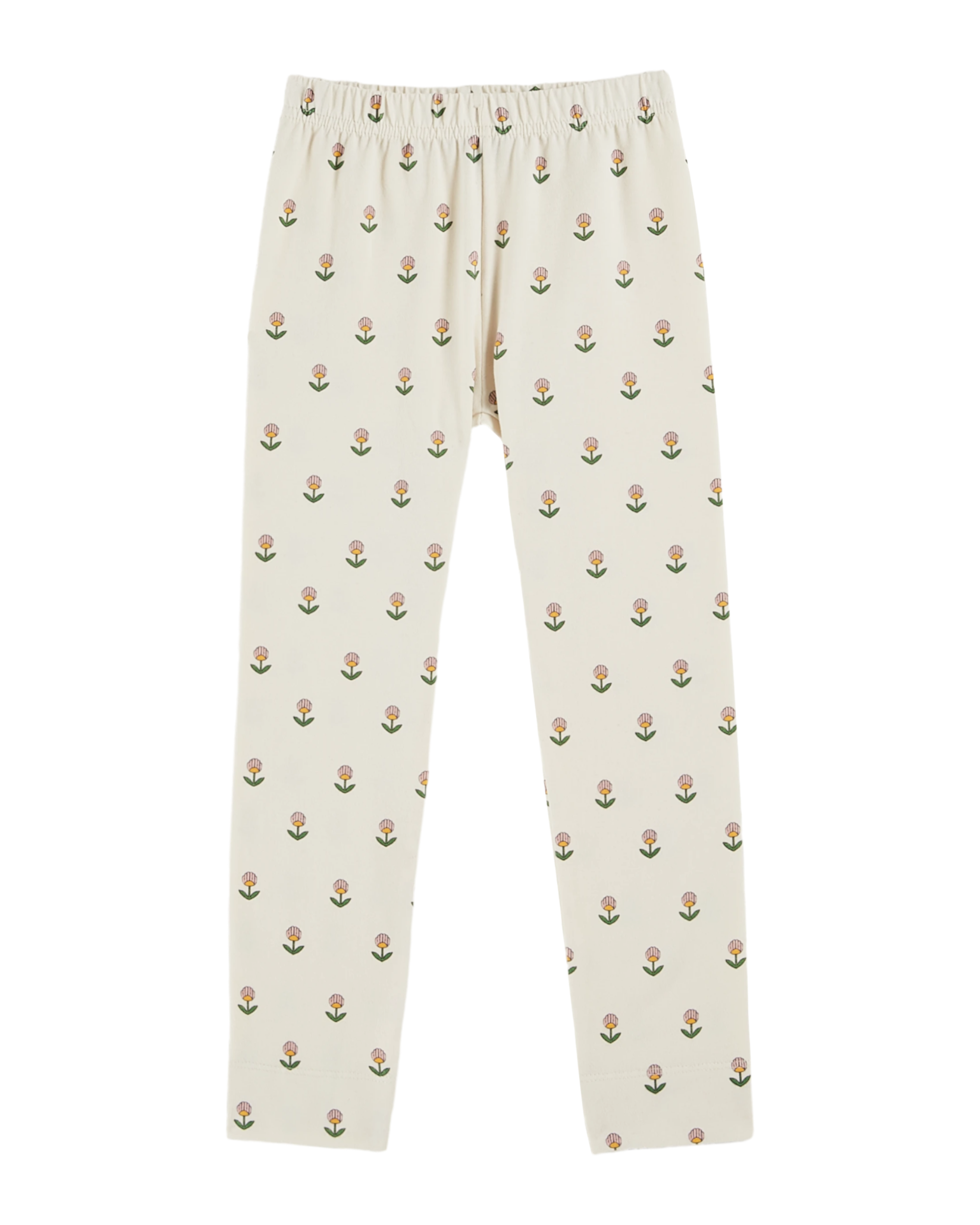 Cotton and elastane jersey leggings with pink petals on an off-white background. With its elasticated waistband and soft organic fabric, these leggings are an original basic that complements any outfit.
