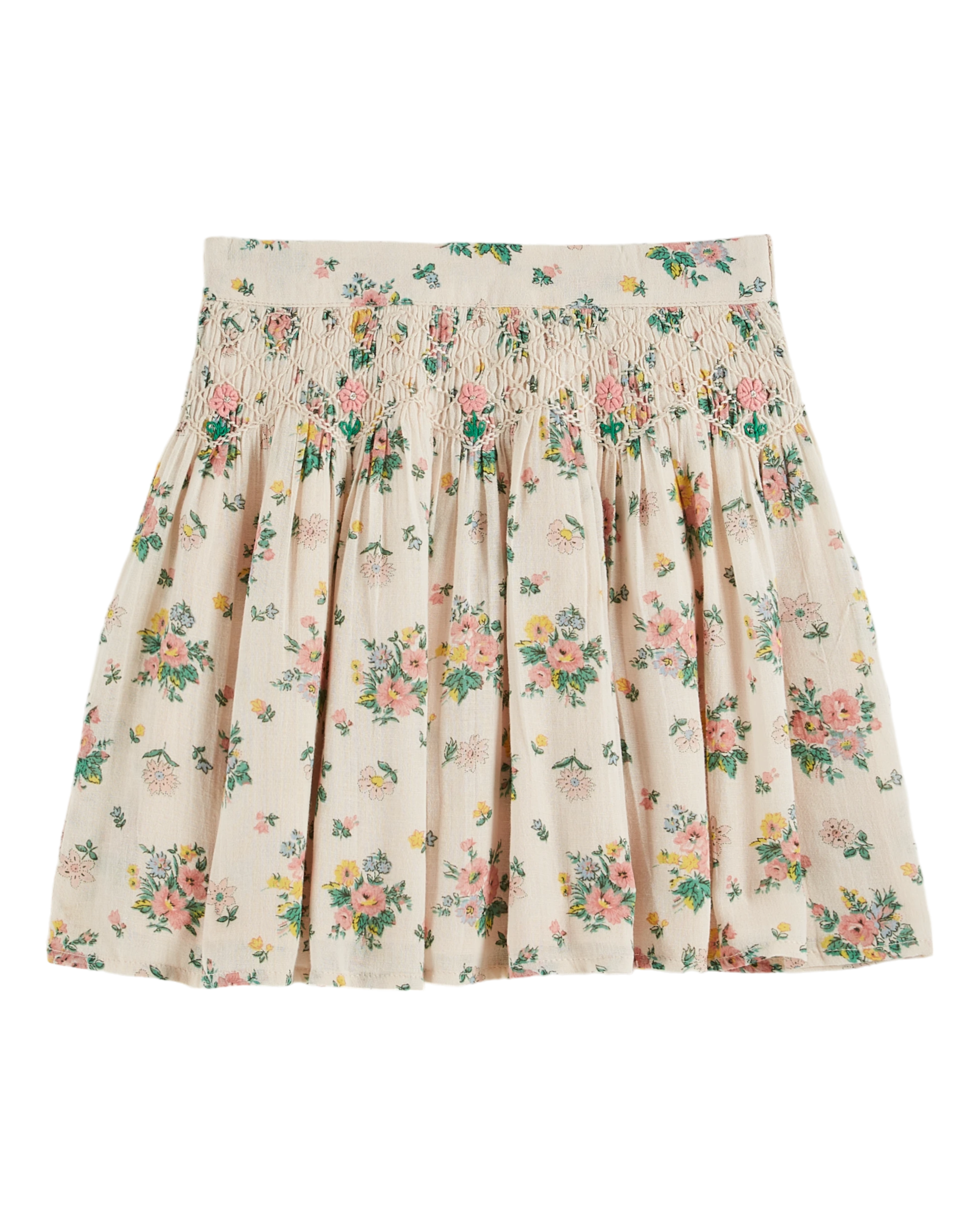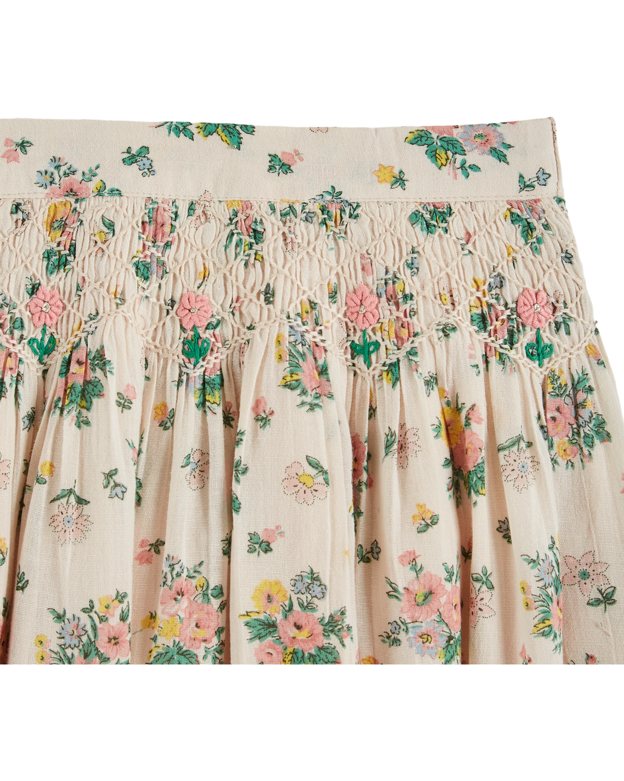 Short skirt in powder-beige cotton gauze dotted with bunches of flowers. Under the waistband, elasticated in the back, tonal smocks gather the fabric. The smocked end in spikes featuring pink flowers with shiny hearts. All the embroidery is handmade by Indian artisans. Beneath the smocks, the skirt flares out all the way to the hem. It is lined in ecru cotton voile to counter the transparency of the material.