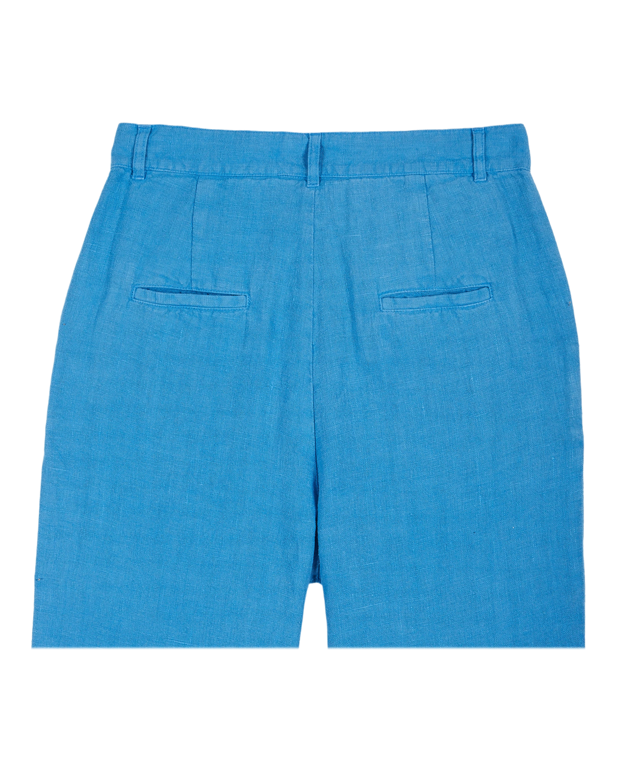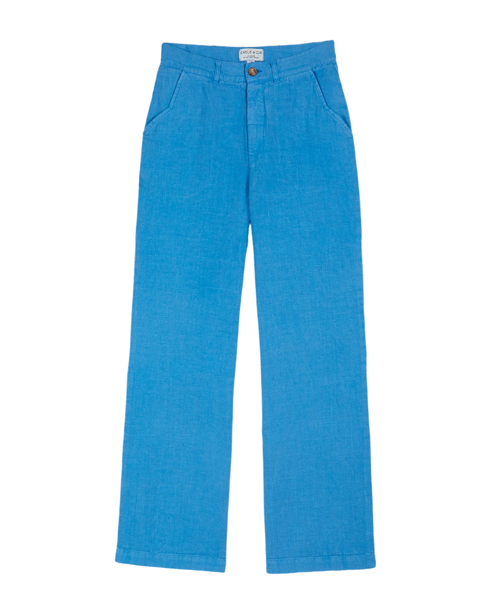 Wide, straight pants in blue linen. Two Italian pockets, with a cutout for French chic, and two raglan back pockets. A pair of pants that will accompany your active days as well as your moments of idleness.