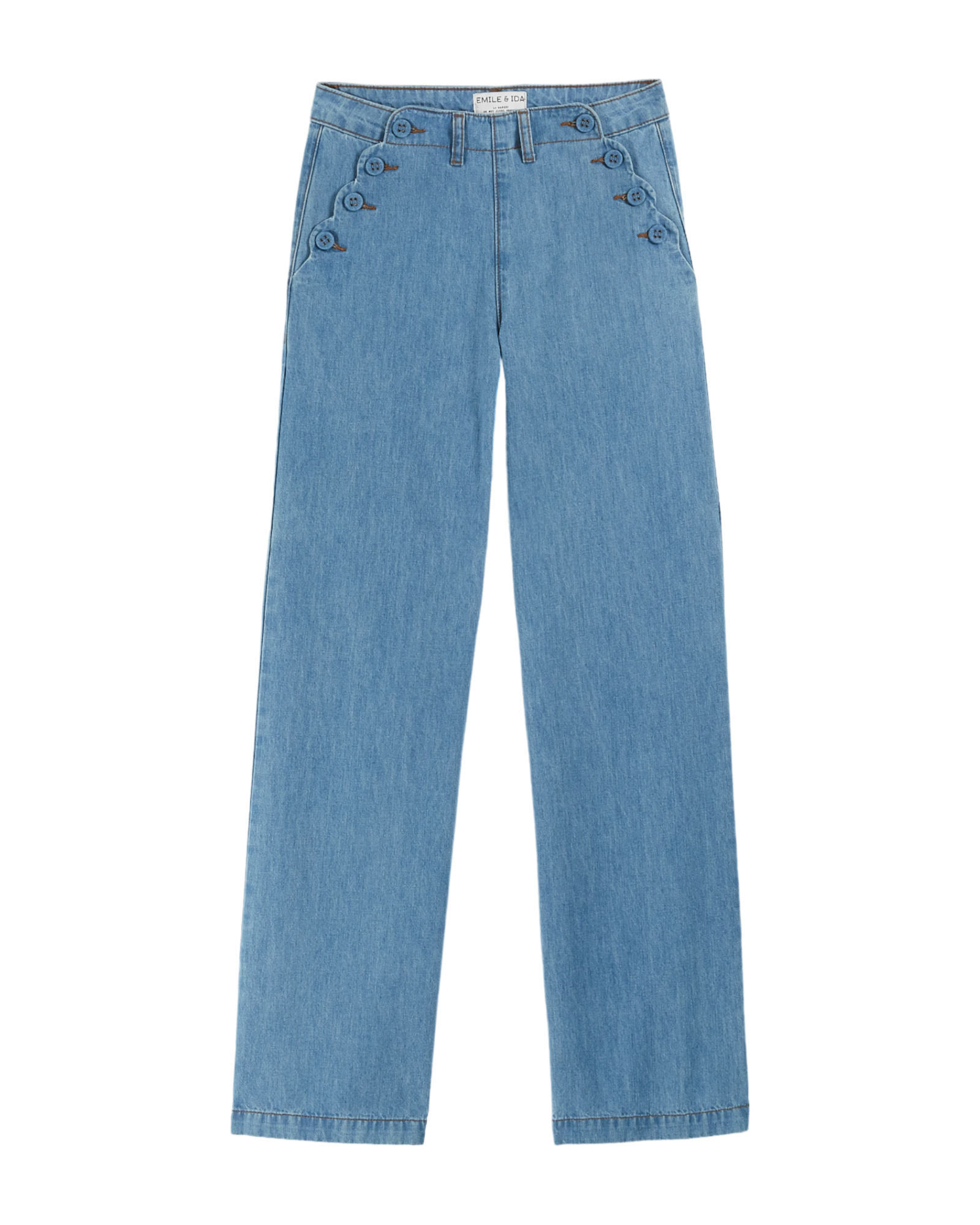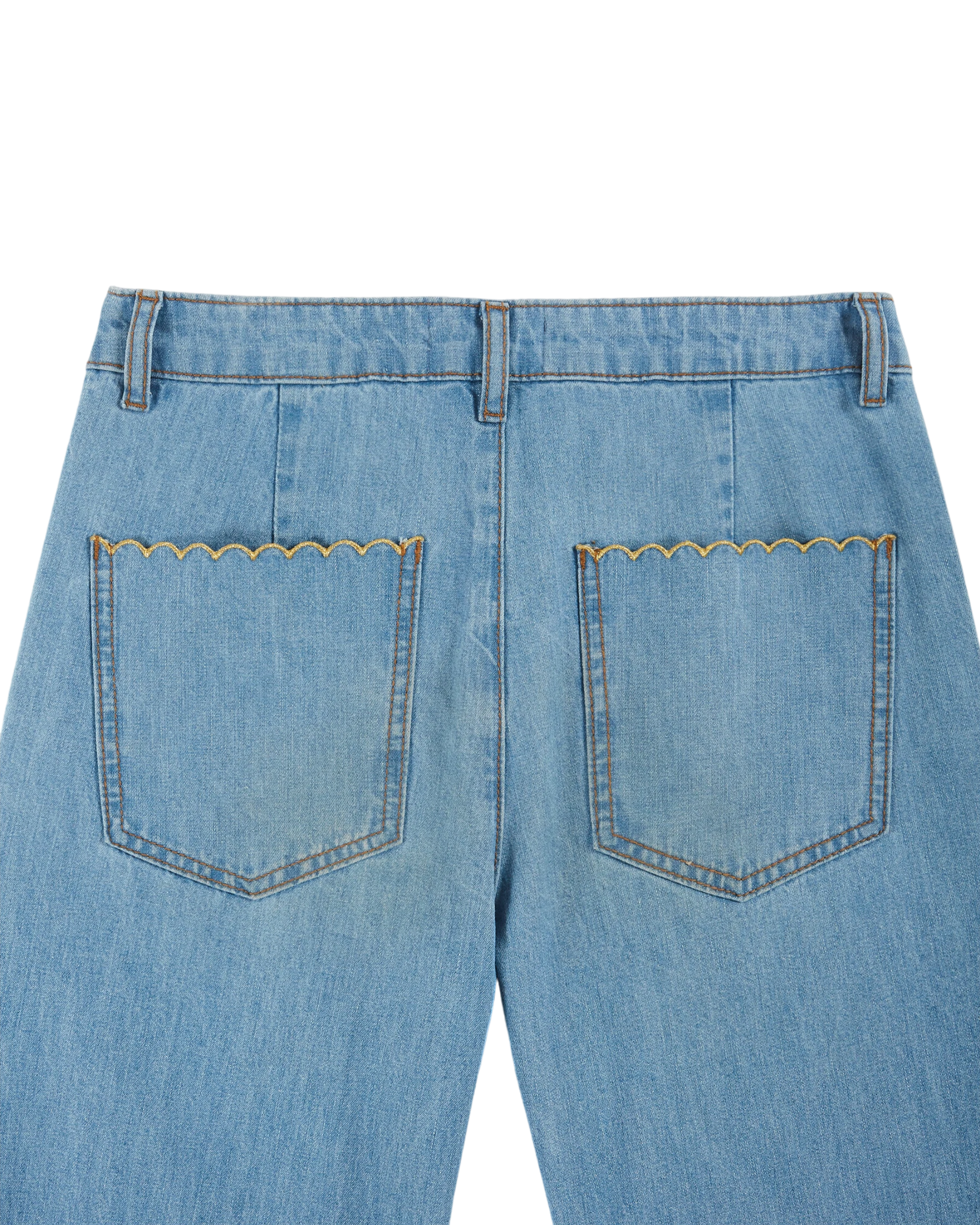 Blue denim organic cotton bridge pants. With their wide cut, they feature oblique bridge cut-outs, replacing the classic Italian pockets. Fabric-covered buttons highlight the scalloped openings, adding an elegant touch.At the back, between the waistband and the two gold lurex scalloped patch pockets, are two darts for a precise, flattering fit.
