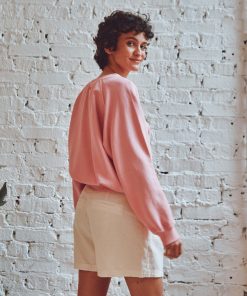 Sweatshirt in plain pink organic cotton fleece jersey. Featuring a classic, timeless cut, this sweatshirt wraps you in softness and comfort with its long raglan sleeves. The real uniqueness of this sweatshirt lies in its natural dyeing. It’s piece-dyed using mineral pigments, a more environmentally-friendly dyeing method. It also offers a subtle, unique color that develops a patina over time.