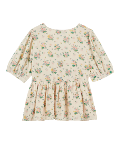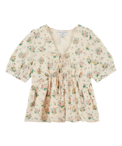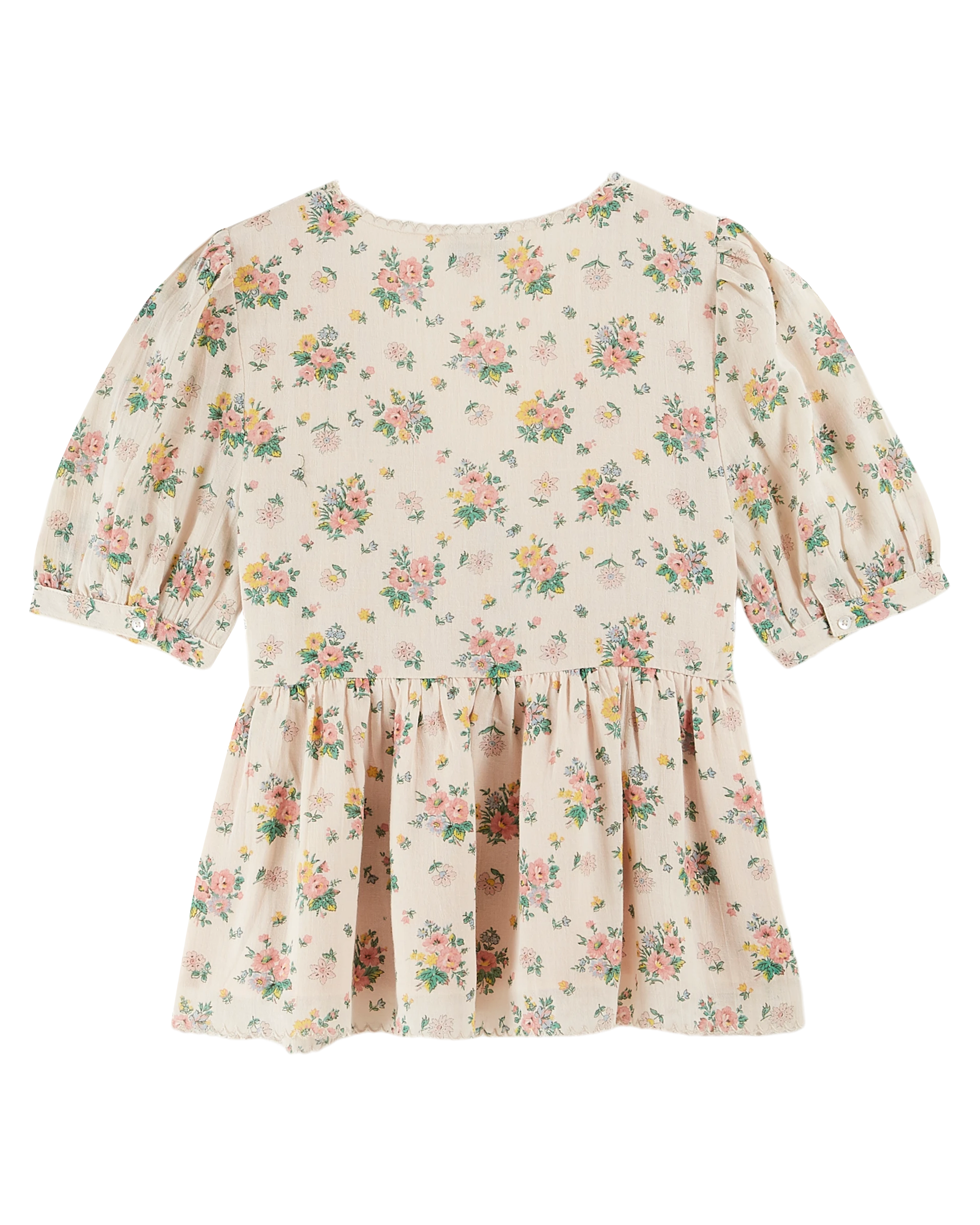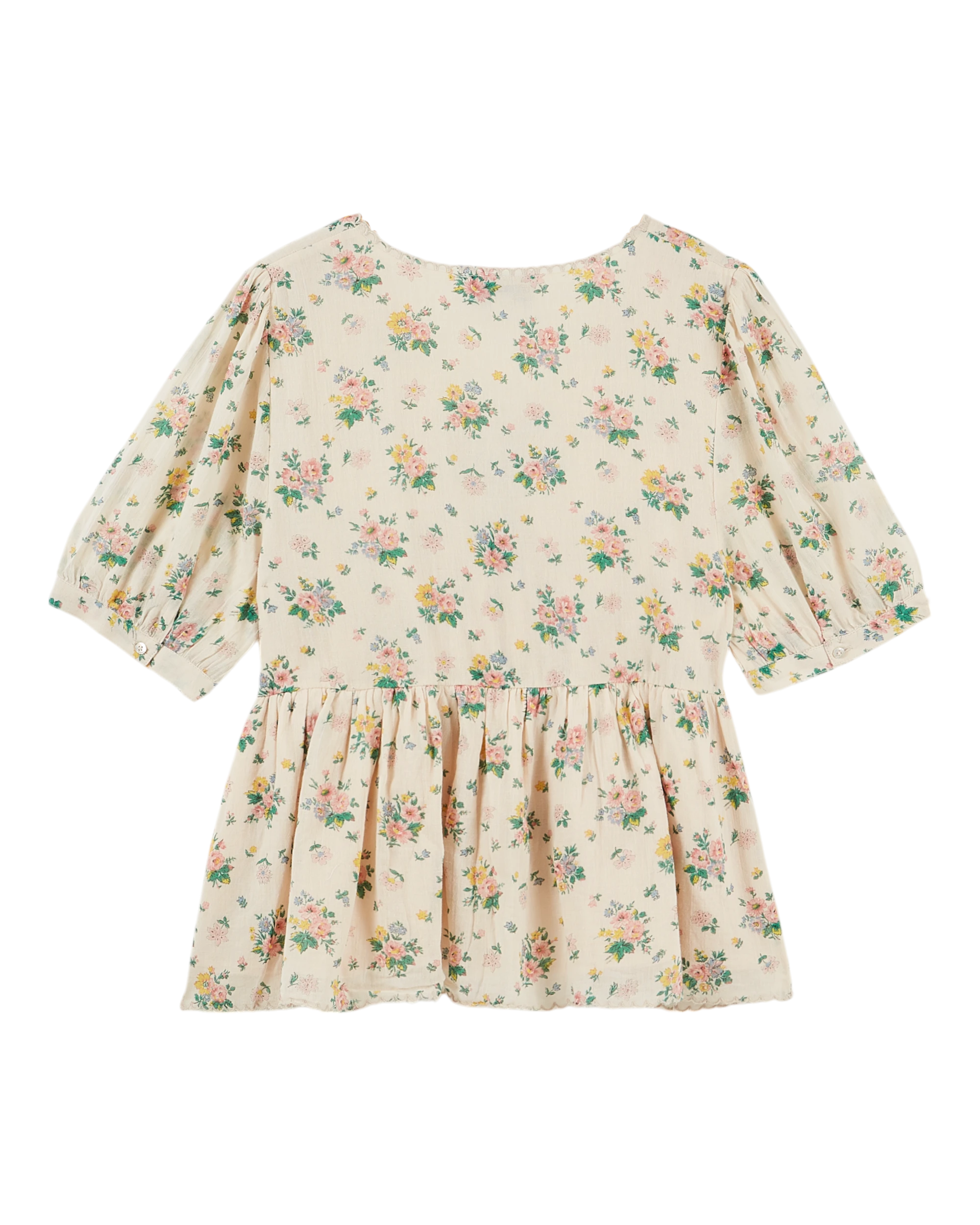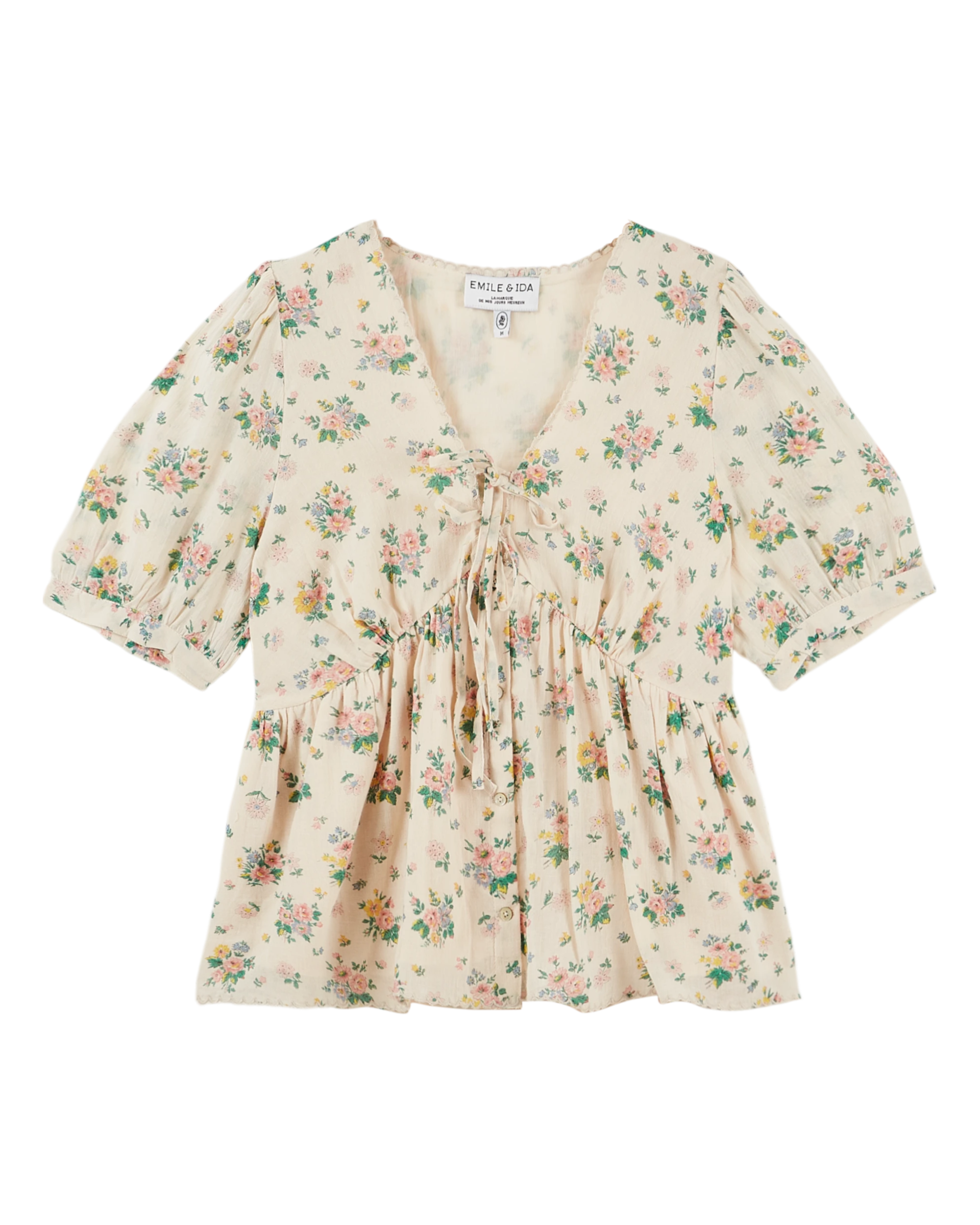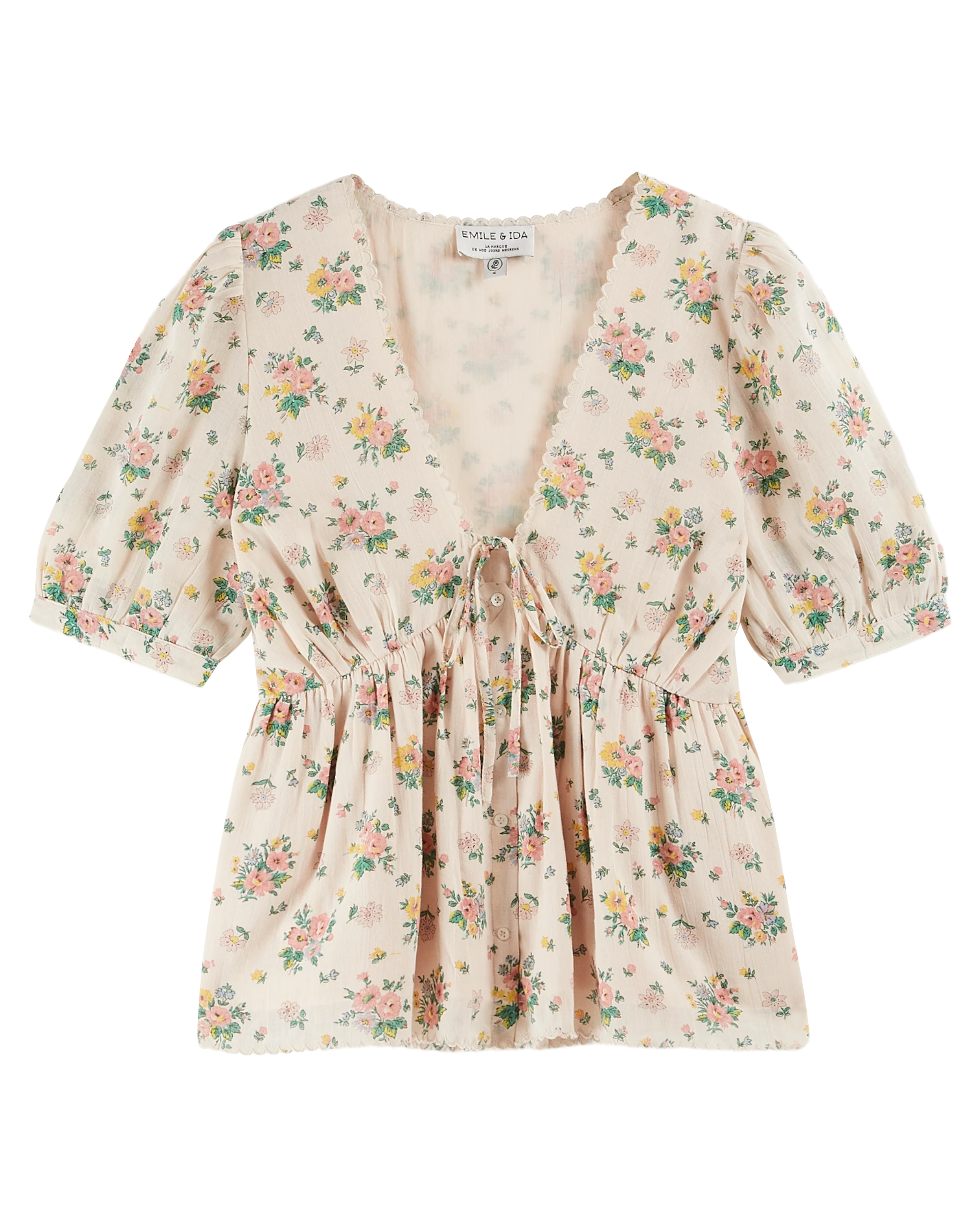 Short-sleeved blouse in powder-pink cotton gauze, adorned with a multitude of pastel flowers. The balloon sleeves and V-neckline, embellished with a small adjustable bow to modulate the indentation, add a romantic touch. The scalloped bottom and neckline are carefully hemmed with tone-on-tone satin stitch. Like the cuffs, the blouse closes with natural mother-of-pearl buttons. A powder-pink cotton voile lining provides discretion and comfort, offsetting the thinness of the cotton gauze.