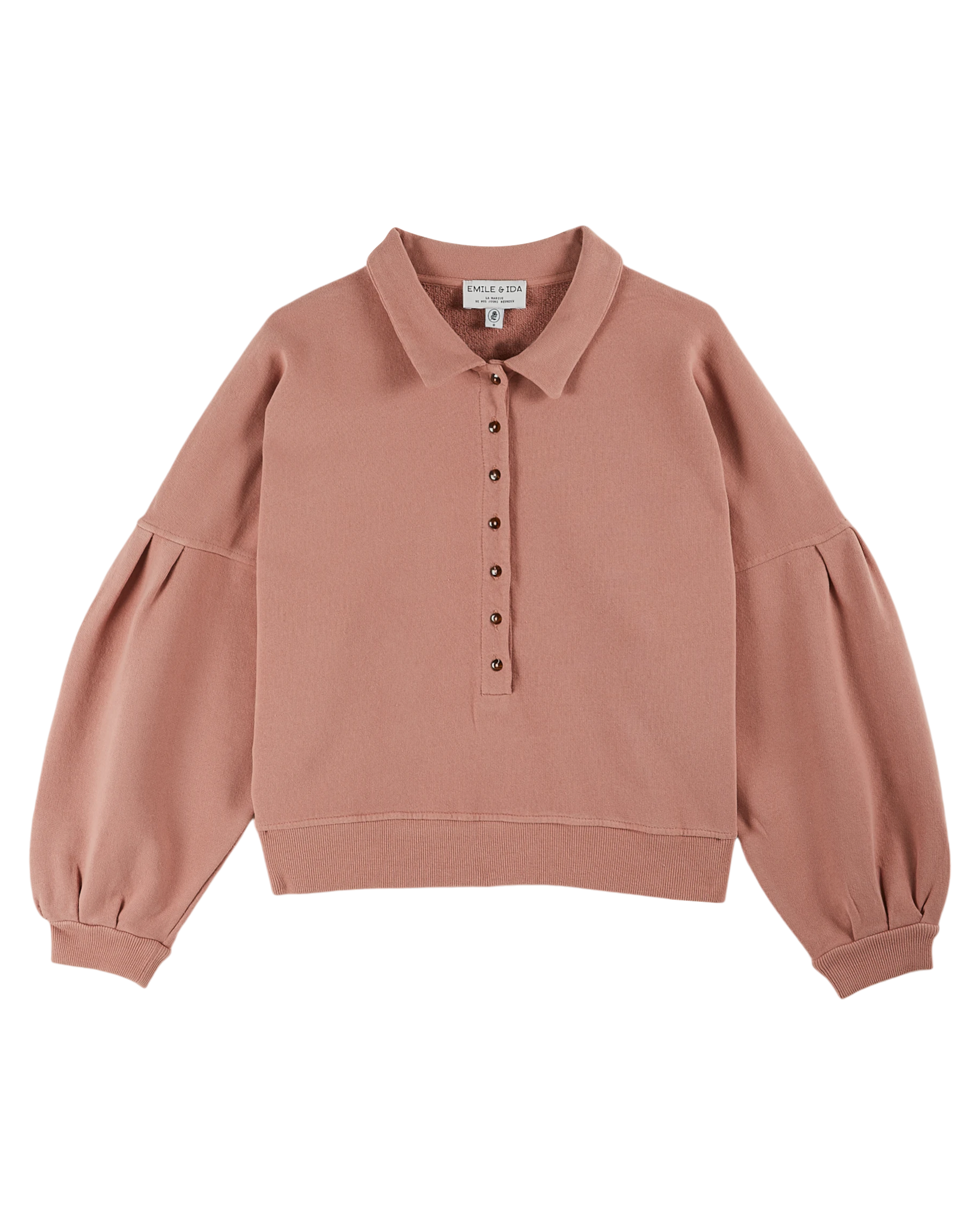 Sweatshirt in terracotta organic cotton fleece. A pointed collar that breaks with the traditional ribbed hem, a delicate button opening, and offset sleeves with flat pleats that give them volume. These details feminize the sweatshirt and add a touch of originality.